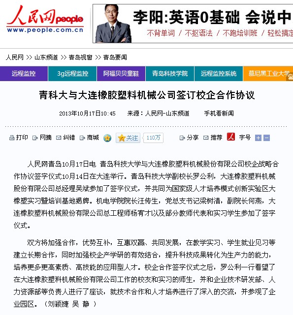 11月14日,青岛科技大学与大连橡胶塑料机械股份有限公司校企战略合作协议签字仪式在大连举行。