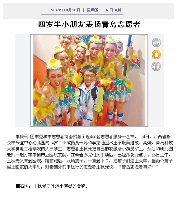 11月13日上午,pp电子分团委收到一封来自青岛港中旅(山东)旅行社有限公司的感谢信,信中表达了对我院学生机自114班任建桥同学服务第十届中国艺术节的感谢。