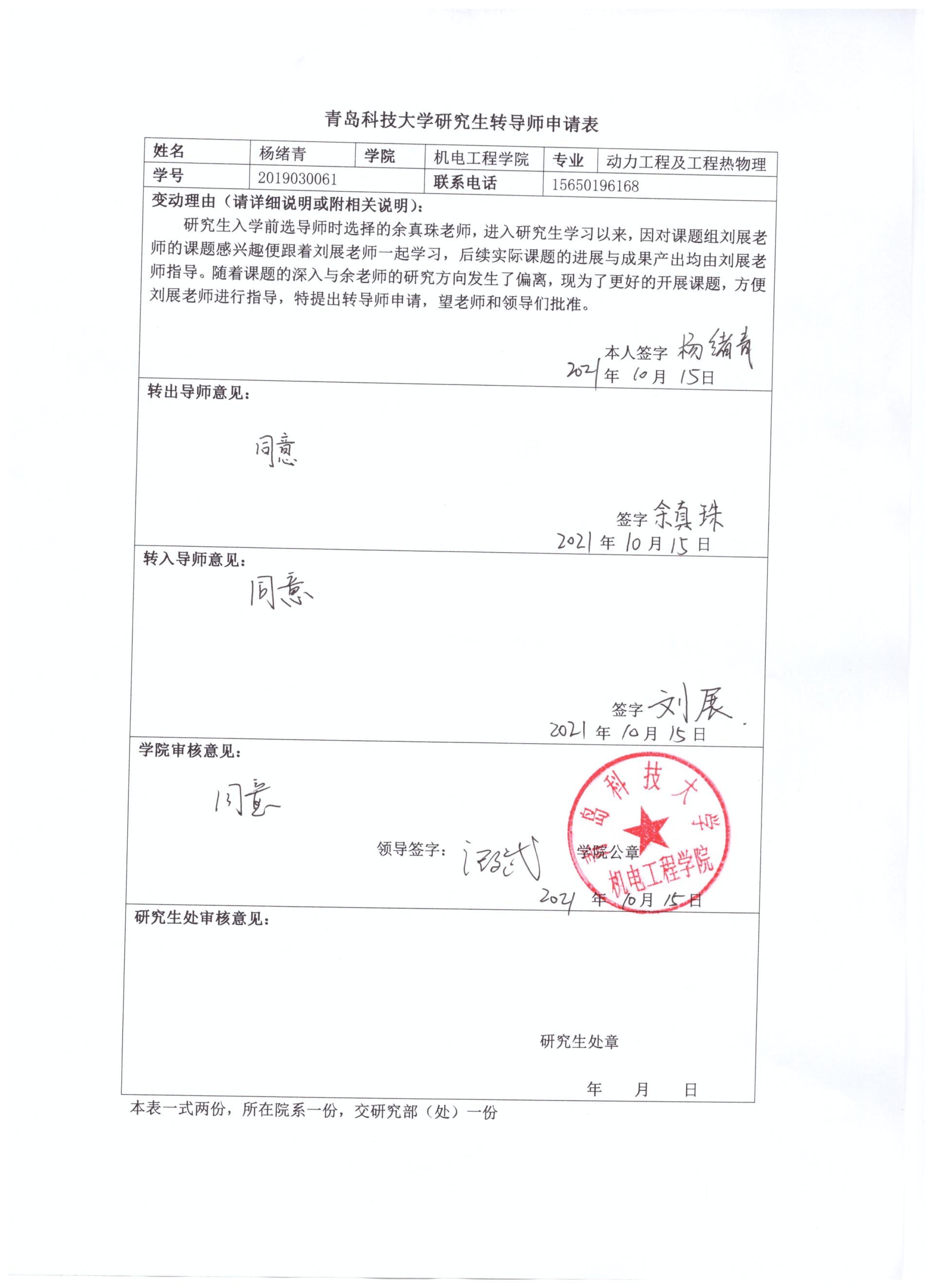 青岛科技大学研究生转导师申请(杨绪青)