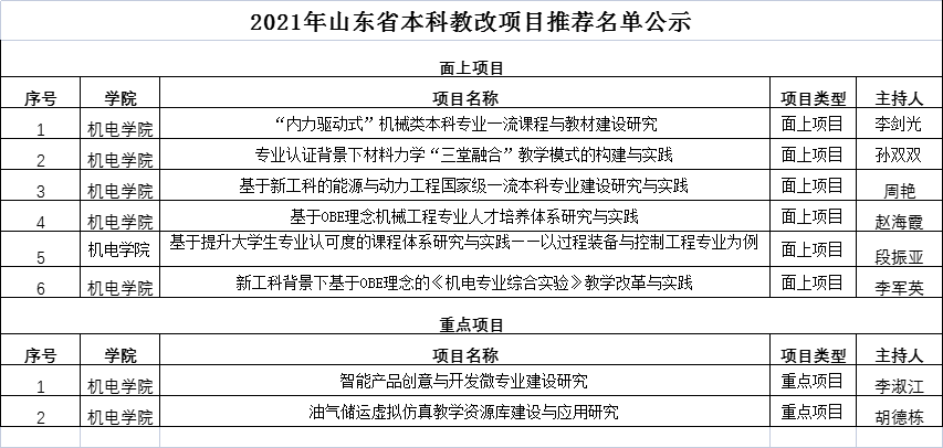 根据学校《关于组织开展2021年山东省本科教学改革研究项目立项及管理工作的通知》要求,pp电子开展了省级教改项目评审工作,经项目负责人申报,学院评审,共推荐新立项8项,现将结果公示如下: