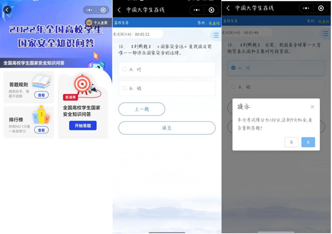 pp电子官方网站组织同学们参与“全国高校学生国家安全知识问答活动”,全面普及学生安全意识,强化安全教育,大力营造校园安全文化氛围。知识题目涉及国家安全、网络安全、疫情防控、宿舍安全和食品安全等方面,2000余人积极参与知识竞答。此次答题活动具有很强的现实意义,在一定程度上进一步提升学生安全知识储备,提高了同学们学习安全知识的主动性与积极性。要切实增强学生的总体国家安全观和责任感,把校园安全工作抓早抓小、抓实抓细,营造时时讲安全,事事讲安全,人人讲安全,人人抓安全,保证人人安全的良好校园氛围。
