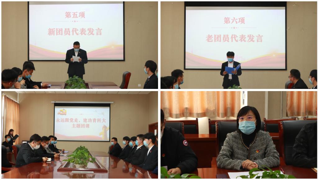 会上,新发展团员代表油储201班周鹏飞发言:“很荣幸今天我能以团员的身份站在这里,首先我要感谢团组织对我的培养与帮助。在以后的学习与生活中,我要锤炼品格明大德、矢志奋斗担大任、坚持与党同心同向,为建设社会主义现代化强国而奋斗。”老团员代表新能源202班郝辰铭对新发展团员们送出祝福与寄语:“首先,我要祝贺在座的各位新团员加入共青团这个大家庭,在座的各位都和我一样感受到肩上多了一份责任、一份义务。作为团员,我们要始终铭记前辈的奋斗,牢记我们肩上的责任,不断在学习中增长知识、提升素质、练就本领,成为优秀的社会主义事业接班人。”紧接着,王娟娟为在场的团员代表上 “永远跟党走,建功青科大”主题团课,告诫团员们要牢固树立永远跟党走的理想信念,厚植家国情怀、坚守人民立场、历练理论功底,在新的岗位上要实实在在地引领、带动、服务身边人一起成长,尤其是要把科大精神、橡胶品格、五有理念体现在点点滴滴的奋斗中。