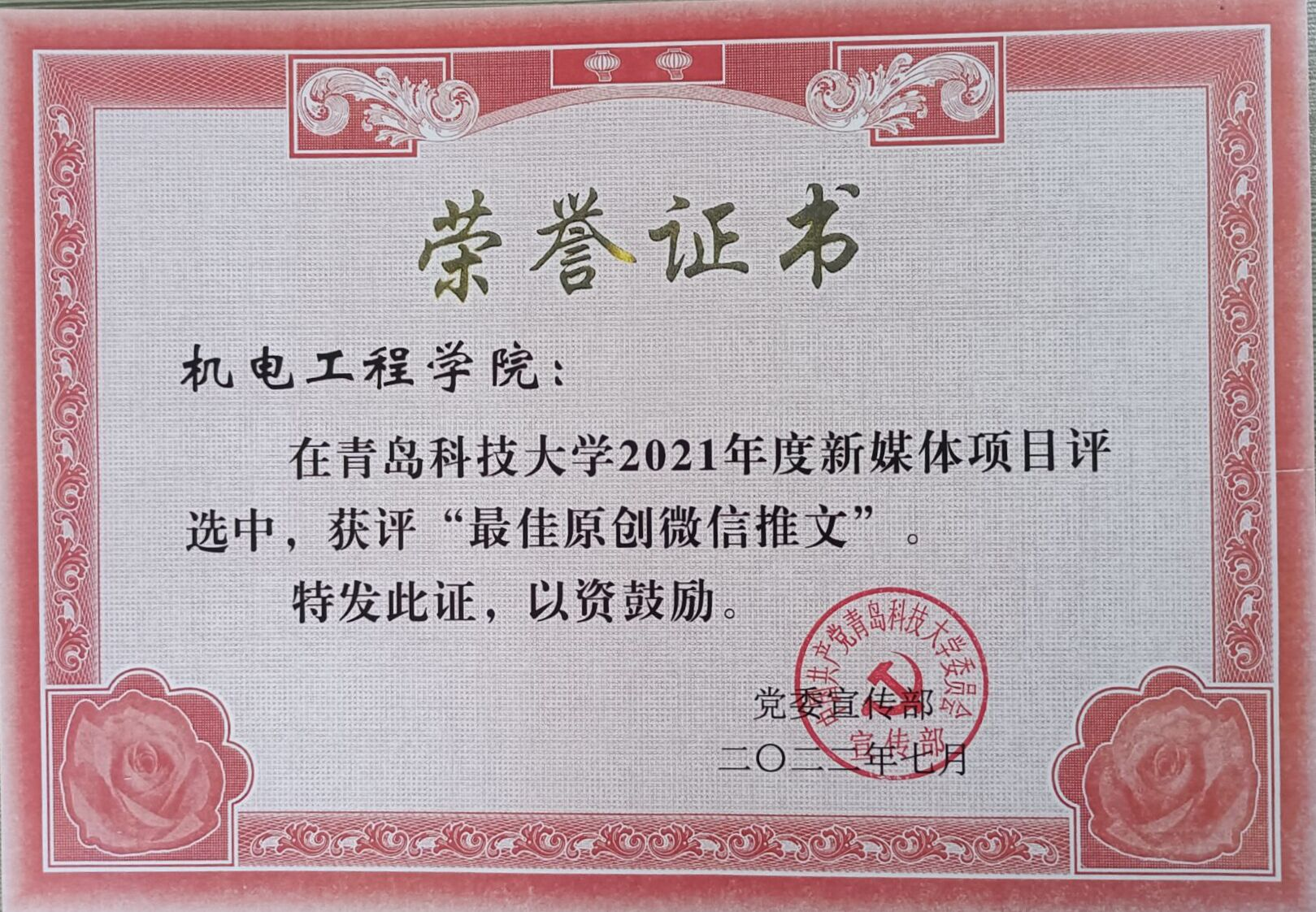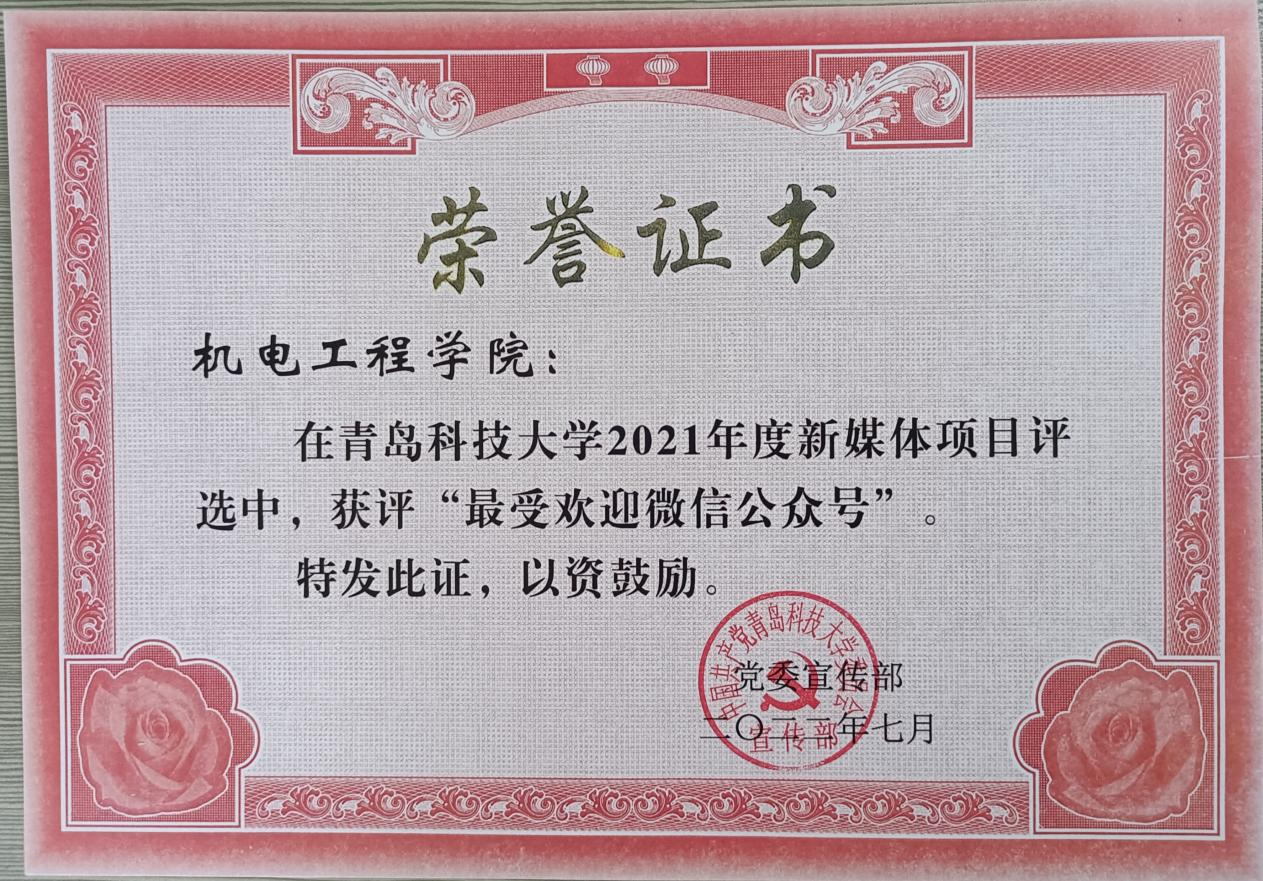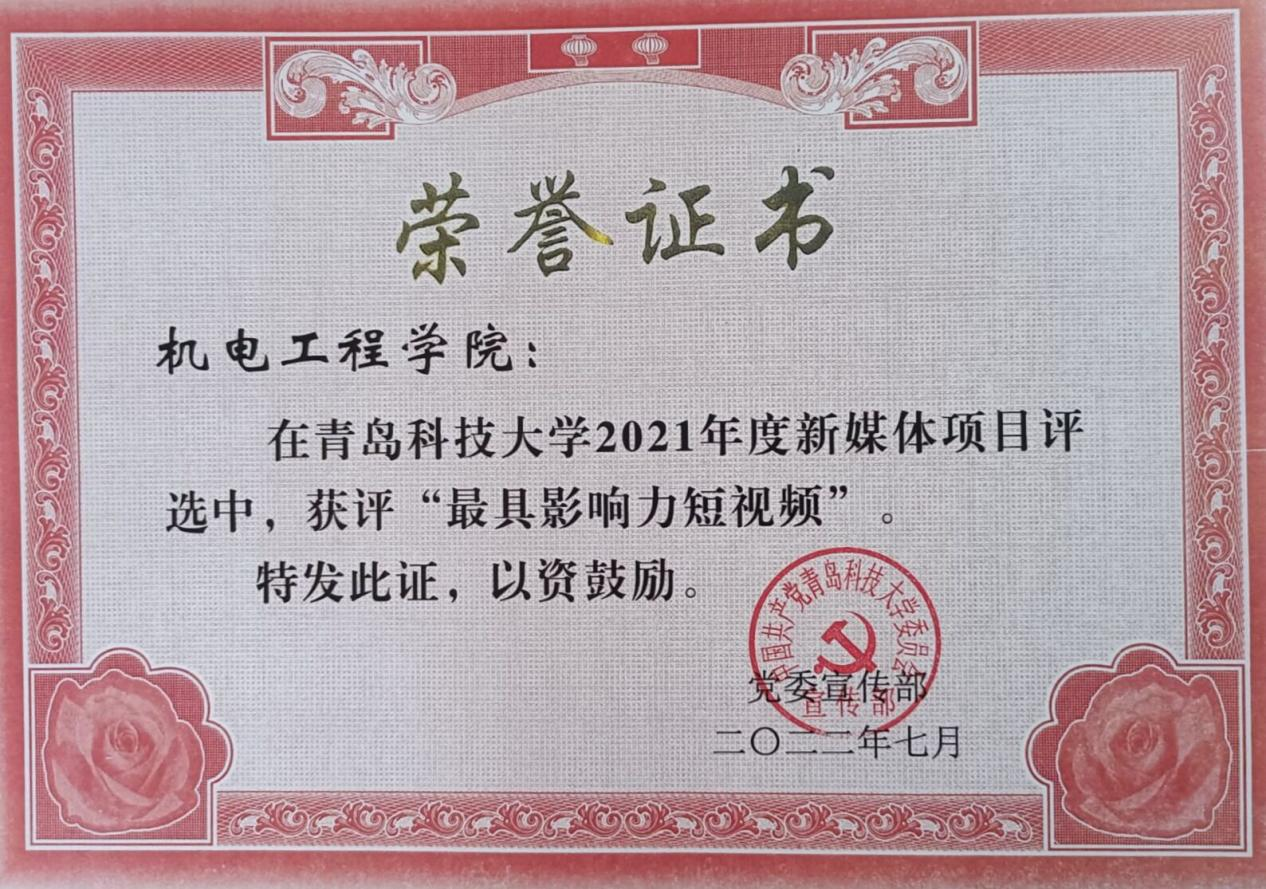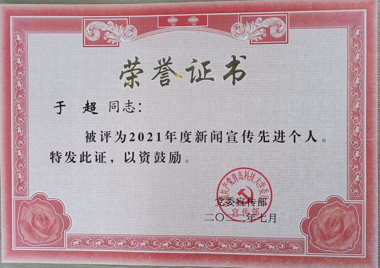 此外,学院在2021年度新媒体项目表彰中荣获多项荣誉。学院荣获2021年度新闻宣传先进单位,微信公众号“青岛科技大学pp电子官方网站”荣获2021年度最具影响力微信公众平台,新媒体项目评选中获评“最具影响力短视频”、“最佳原创微信推文”和“最受欢迎微信公众号”,于超获2021年度新闻宣传先进个人。