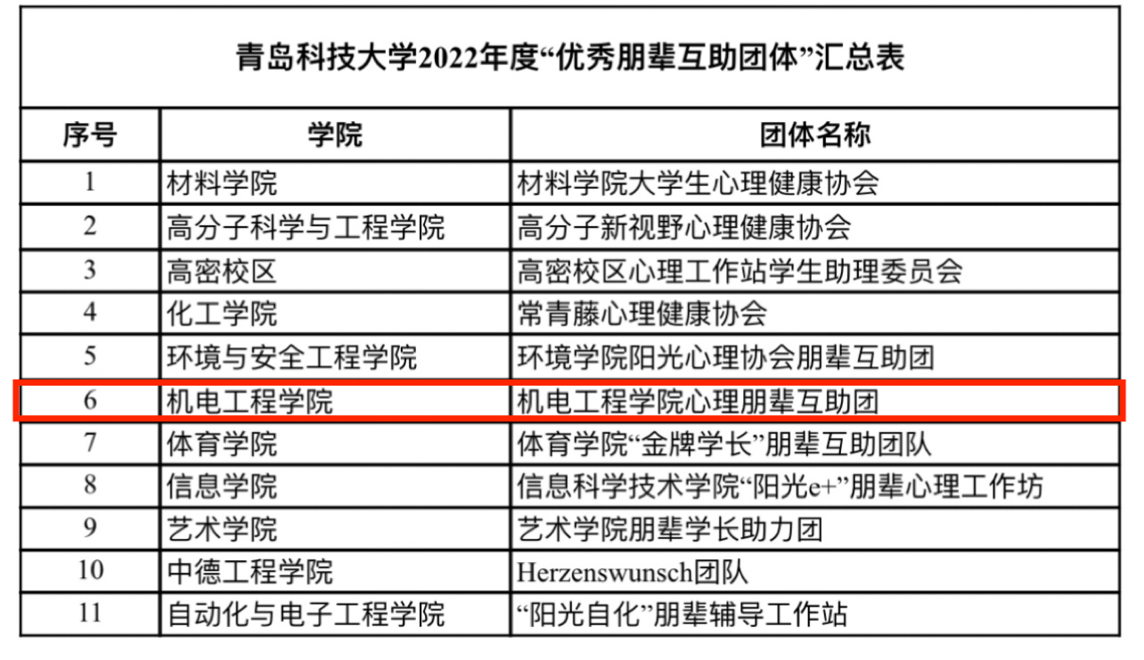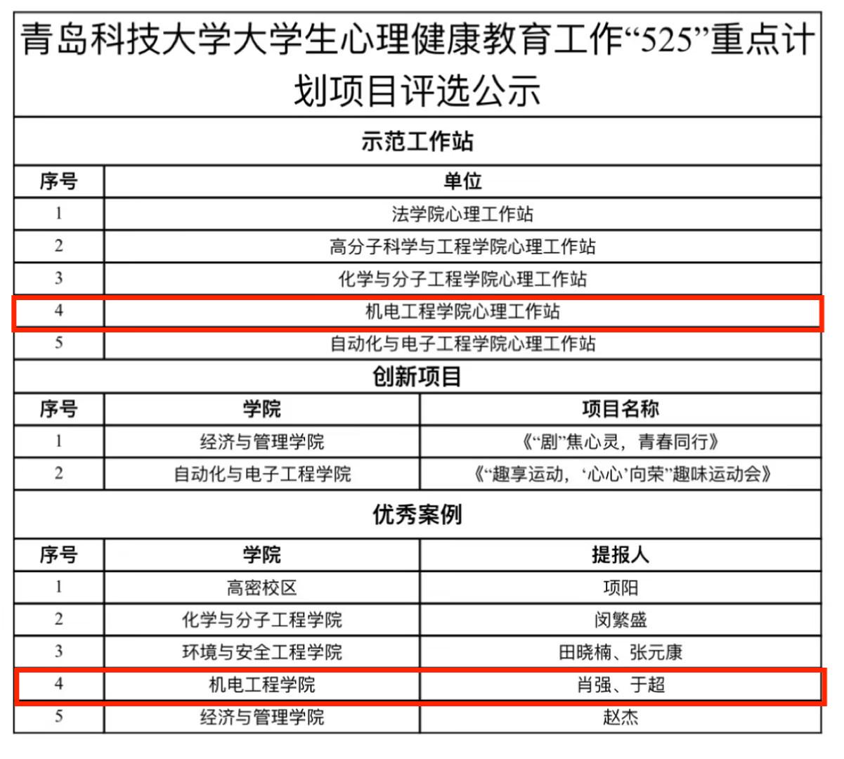 为进一步贯彻落实《高等学校学生心理健康教育指导纲要》文件精神,切实加强心理健康教育工作体系建设,提升心理育人质量,近期,青岛科技大学发布了《青岛科技大学大学生心理健康教育工作“525”重点计划项目评选公示》和《青岛科技大学2022年度优秀心理委员、优秀朋辈互助团体评选公示》。pp电子官方网站在本次评选中荣获佳绩。