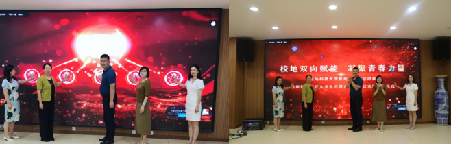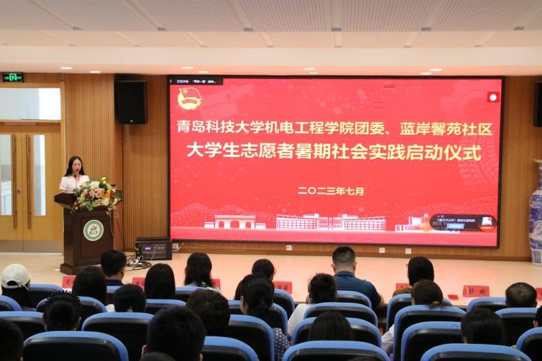与会领导共同完成青岛科技大学pp电子官方网站团委、蓝岸馨苑社区大学生志愿者暑期社区实践启动仪式。