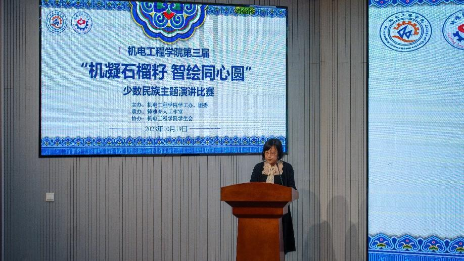 赛前,王娟娟老师致辞。王娟娟谈到,希望各民族同学以此次主题演讲大赛为契机,厚植家国情怀,铸牢中华民族共同体意识,让青春在以中国式现代化全面推进中华民族伟大复兴的新征程中绽放绚丽之花。