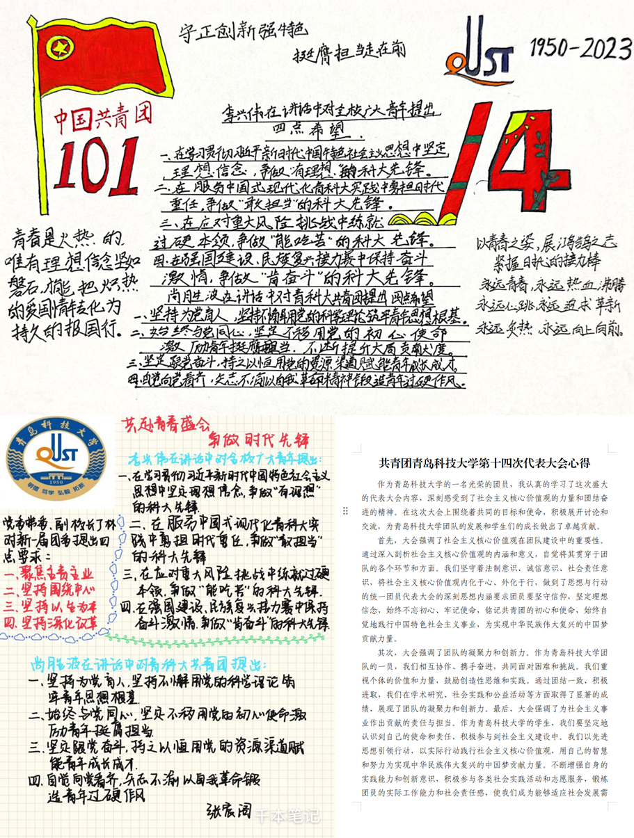 此外,学院组织同学们根据学习成果,创作各类作品。活动自10月31日正式启动以来,得到了广大同学的积极响应和热情参与,共征集到作品30余份。内容涵盖精读笔记、读书心得、手抄报作品等艺术体裁,作品紧扣团代会主题,真实传递了同学们坚定不移听党话、跟党走的坚定决心,以及在新时代新征程上脚踏实地、不忘初心、砥砺前行的坚定信念。