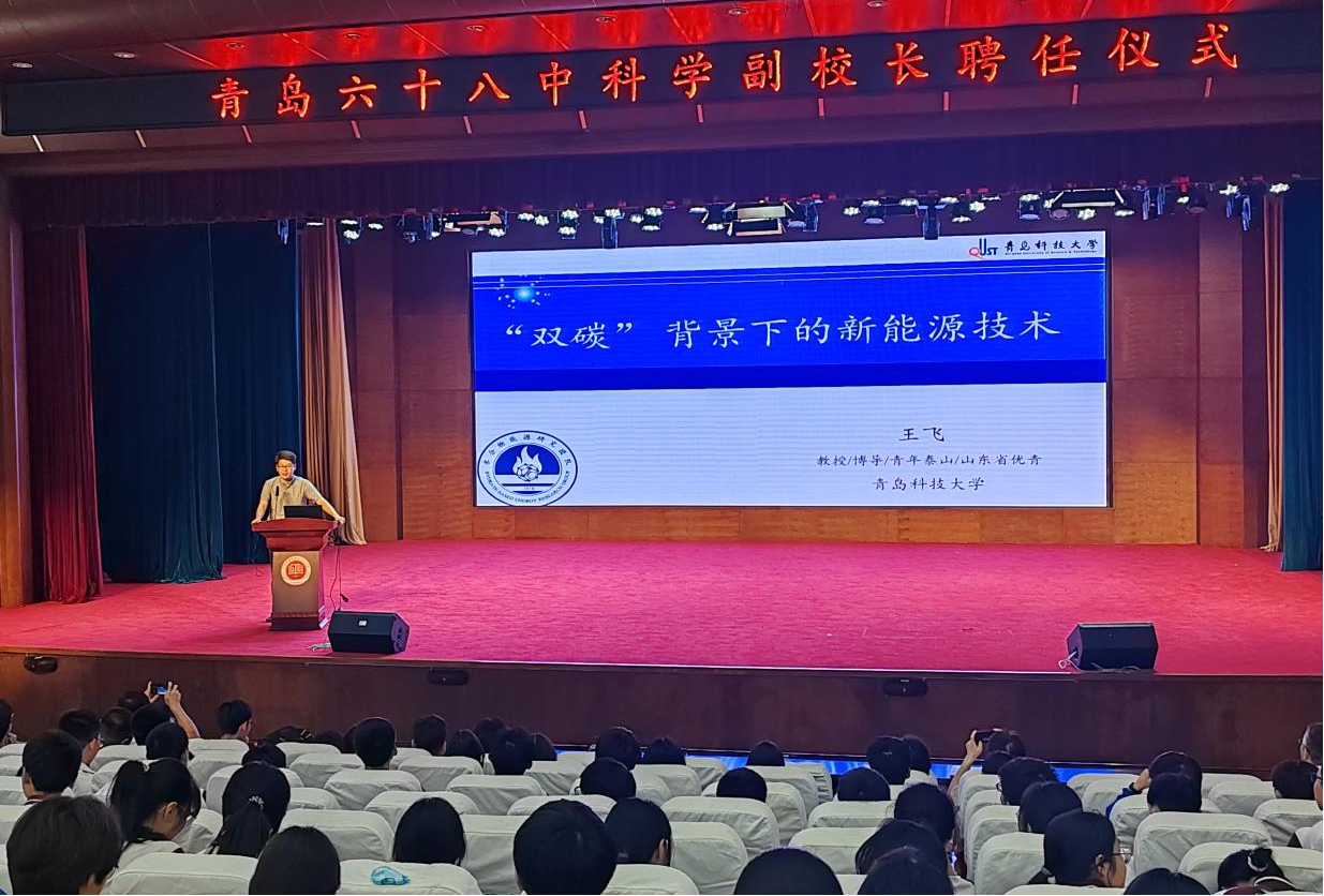 为建设高素质教育科研队伍,7月4日下午,青岛科技大学附属中学青岛六十八中举行科学副校长聘任仪式,学校pp电子官方网站王飞教授应邀出席并受聘担任青岛六十八中科学副校长。作为青岛六十八中科学副校长,王飞为现场师生做了题为《“双碳“背景下的新能源技术》的报告。