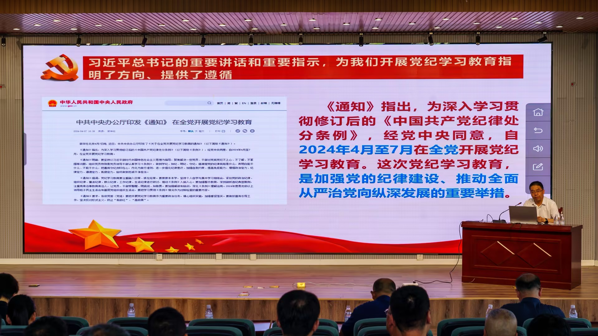 吕万翔围绕党纪学习教育为什么学、学什么、怎么学,从“认真学习领会习近平总书记关于全面加强党的纪律建设的重要论述”“准确把握《条例》的主要内容和精髓要义”“让遵规守纪成为自觉行动”三方面进行了讲授,对《中国共产党纪律处分条例》修订的主要内容进行了重点解读。