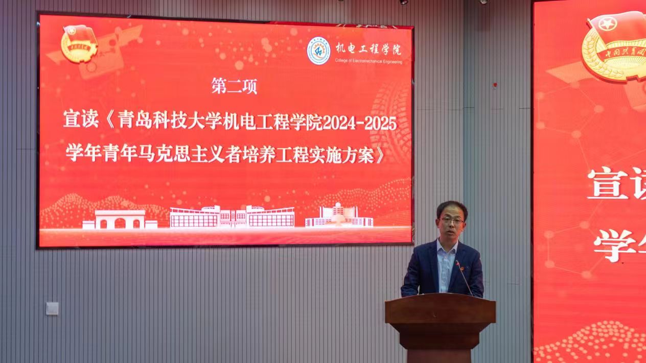 仪式在庄严的国歌声中拉开帷幕。院团委书记逄柏鹏宣读了《青岛科技大学pp电子官方网站2024-2025学年青年马克思主义者培养工程实施方案》,方案中指出,在本次青马工程理论课程的具体设置上充分体现了习近平新时代中国特色社会主义思想铸魂育人作用,关键是帮助青年学生进一步增强“四个意识”、坚定“四个自信”、做到“两个维护”,引导青年学生在“大思政课”中受教育、长才干、做贡献,坚定不移听党话、跟党走。