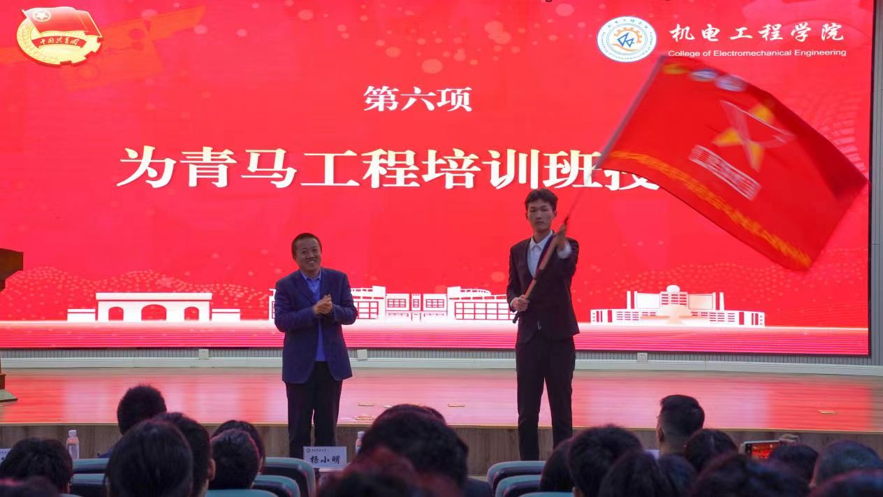 随后,仪式进行授旗环节,由杨小明为青马培训班授旗,本期学员代表褚正接旗。
