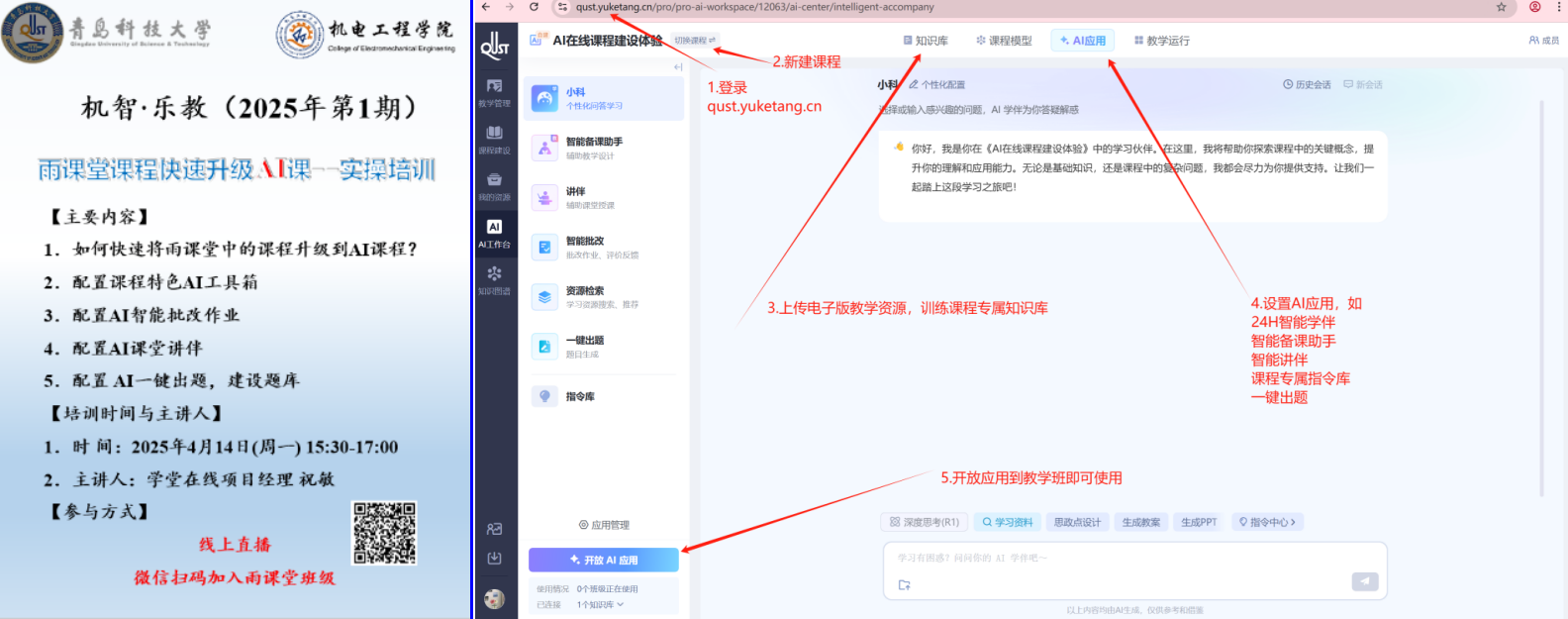 当前,人工智能技术在教育领域的渗透加速,但教师群体普遍面临“工具不熟、场景不明、实践不足”的困境。为进一步加强我院教师的数智意识,助力教师拥抱人工智能,积极探索新环境下的教育教学新模式和技术路径,学院于4月14日开启了“机智·乐教”系列首期培训。本次活动基于学堂在线平台,邀请平台祝经理做了“雨课堂课程快速升级AI课——实操培训”线上报告,为老师们AI课程入门传经送宝,破解教师AI应用难题。