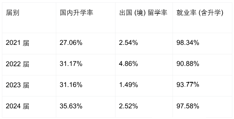 pp电子官方网站持续深耕人才培养,近年来学生升学就业成绩亮眼。从近四年数据来看,学院在国内升学、出国(境)留学及就业等方面均取得显著成效,呈现出良好的发展态势与上升趋势。具体数据如下表所示: