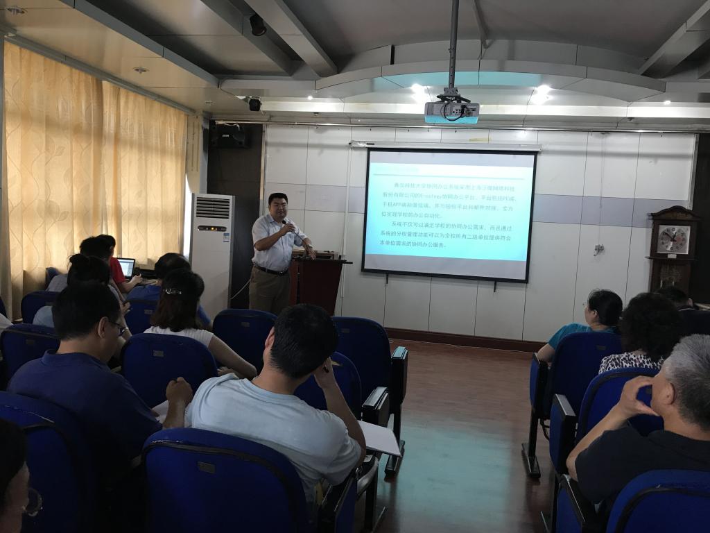 7月11日下午,应学院邀请,财务处处长刘天真携财务处工作人员一行5人和协同办公平台系统(简称OA系统,下同)工程师2人一同来到pp电子举办培训会,pp电子全体教职工参加了培训会。