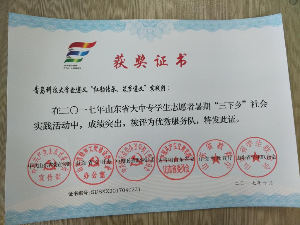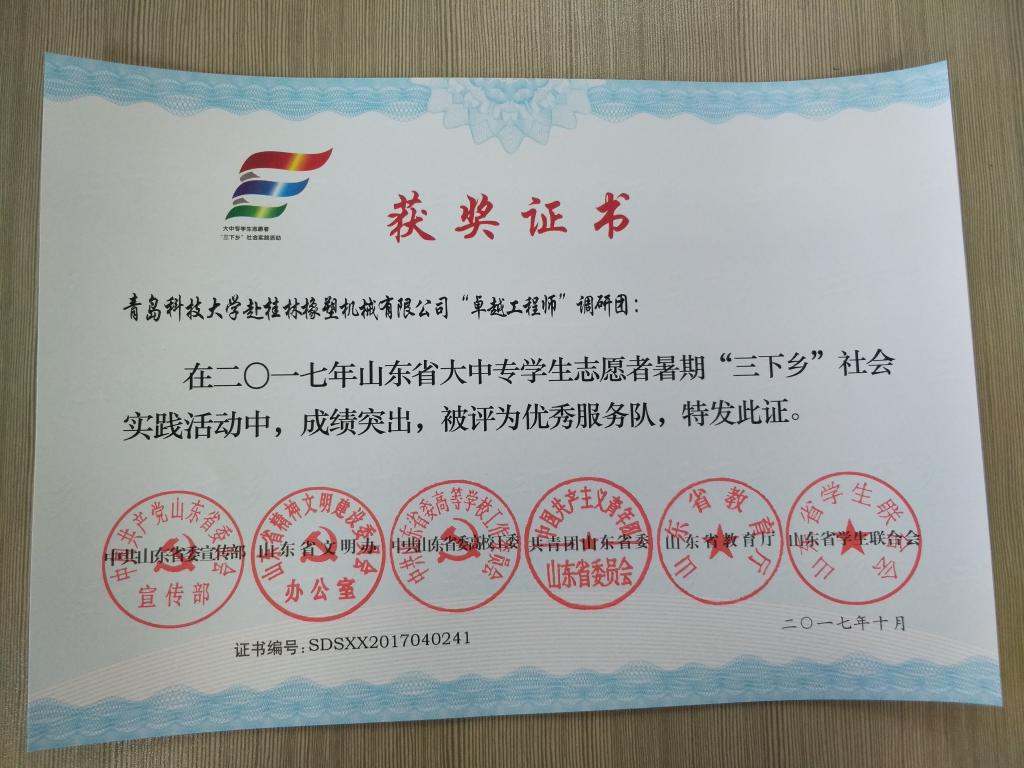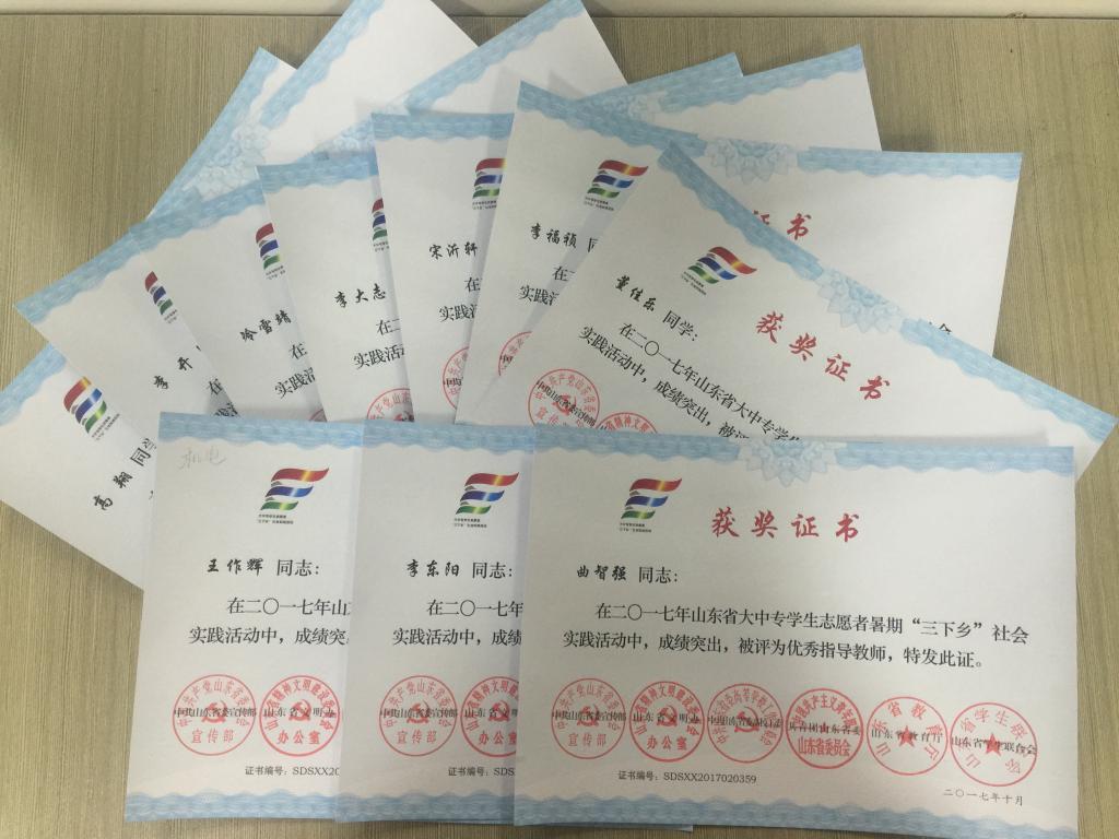 近日,2017年山东省大中专学生志愿者暑期文化科技卫生“三下乡”社会实践活动先进集体和先进个人的证书下发,pp电子赴桂林橡塑机械有限公司“卓越工程师”调研团、赴遵义“红韵传承,筑梦遵义”实践团2支队伍获得2017年山东省优秀服务队称号,王作辉、曲智强、李东阳被评为2017年山东省社会实践活动优秀指导教师,高翔、李开、冷雪靖、李大志、宋沂轩、李福祯、董佳乐7名学生荣获2017年山东省社会实践活动优秀学生。
