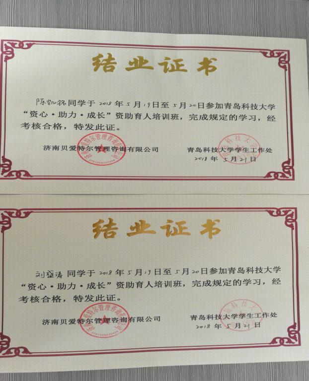 5月19日-20日,青岛科技大学在明德楼学生发展指导中心会议室举行第三期“资心•助力•成长”资助育人培训班。四方、崂山校区各学院2015-2017级家庭经济困难学生近八十人参加培训,pp电子高机171班的陈凯铭和油储171班的刘盛涛作为代表参加。培训由济南贝爱特尔管理咨询有限公司讲师团主讲。