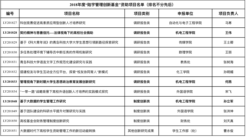 近日,学校下发《关于2018年度“陆宇管理创新基金”资助项目公示的通知》,pp电子申报的项目《契约精神与慈善信托----法律视角下的高校社会捐助》、《管理视角下新时期大学生思想政治教育发展创新研究》和《基于大数据的学生管理工作研究》获学校 2018年度“陆宇管理创新基金”资助。