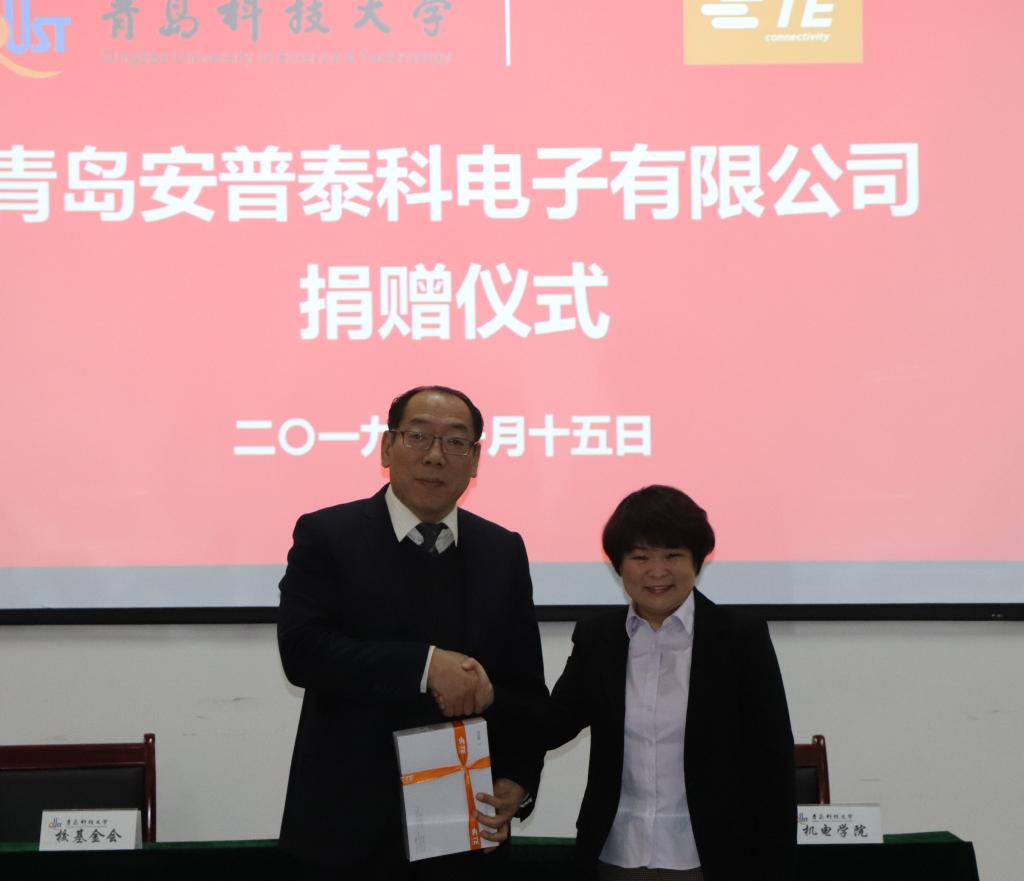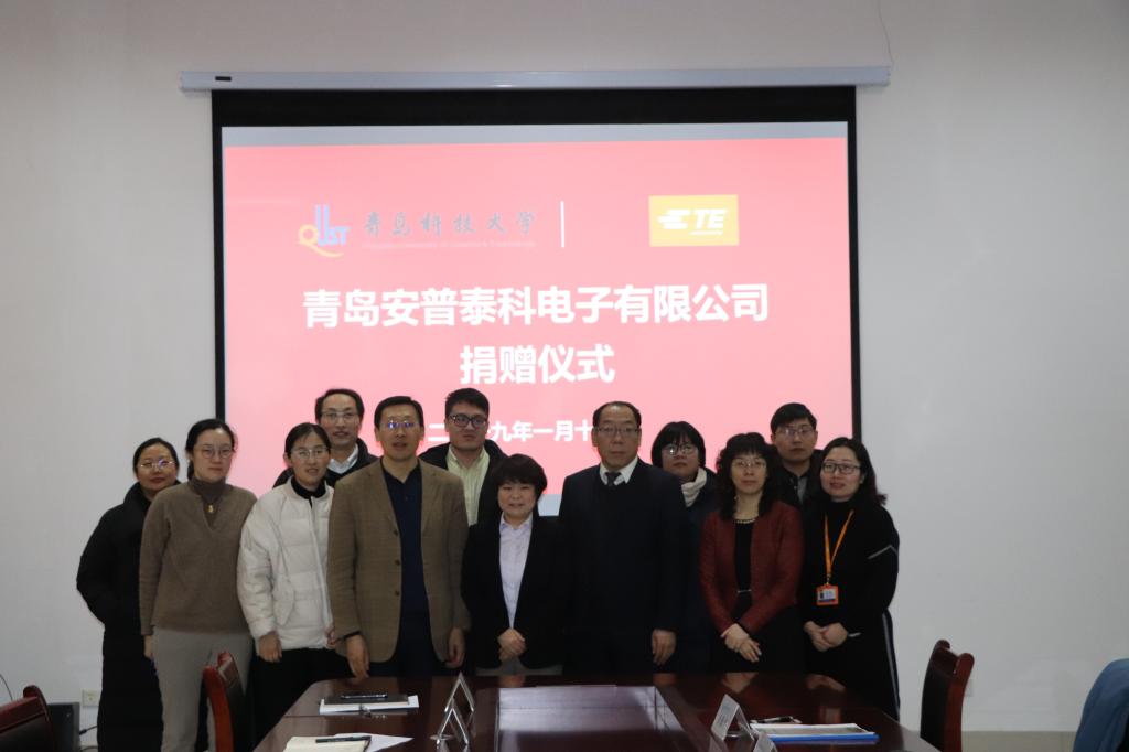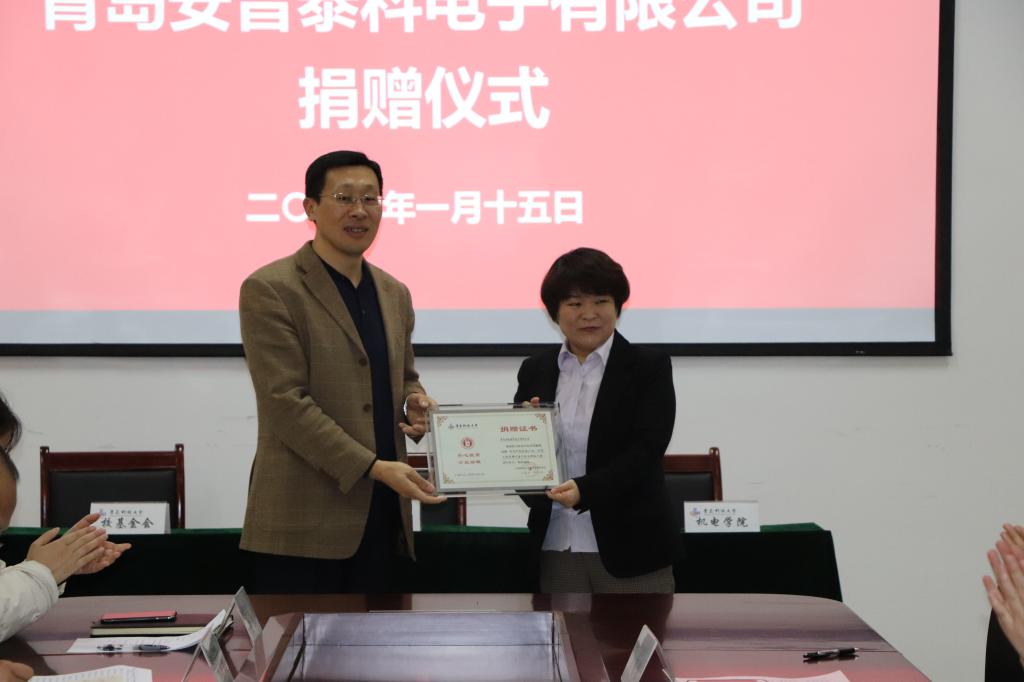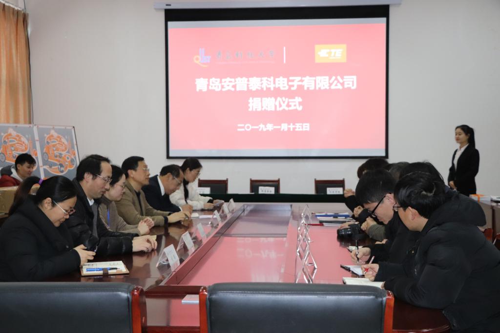 1月15日上午,青岛安普泰科电子有限公司捐赠仪式在机电大楼518会议室隆重举行。校友办主任兼教育发展基金会秘书长聂广明、pp电子党总支书记孙立军、pp电子党总支副书记兼副院长王伟、校教育发展基金会基金管理主任顾珊珊、青岛安普泰科电子有限公司总经理刘国庆、人力资源部总经理黄青霞等参加了仪式。仪式由王伟主持。