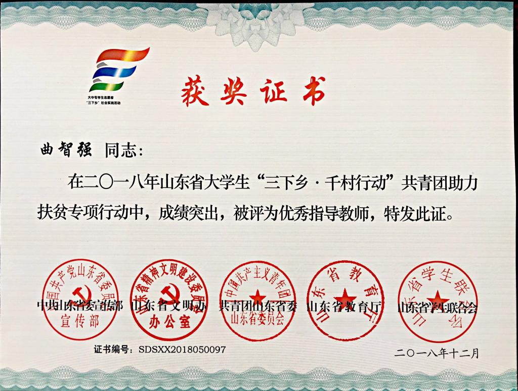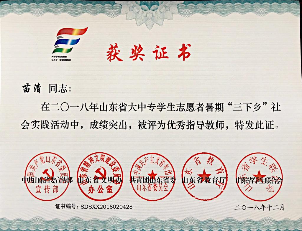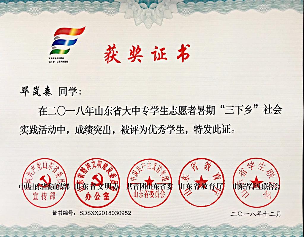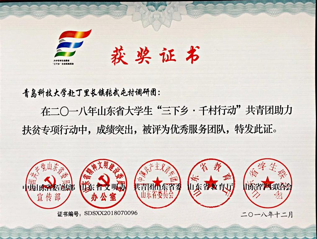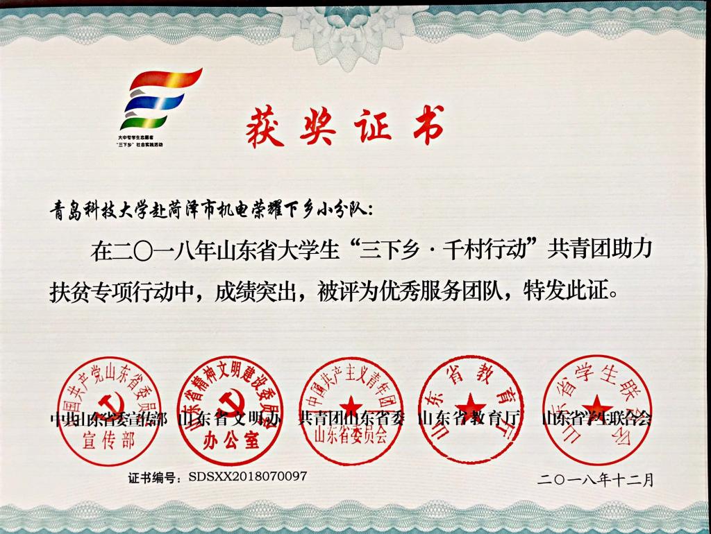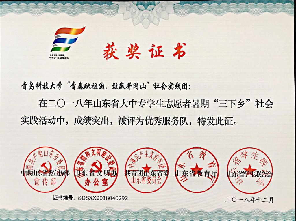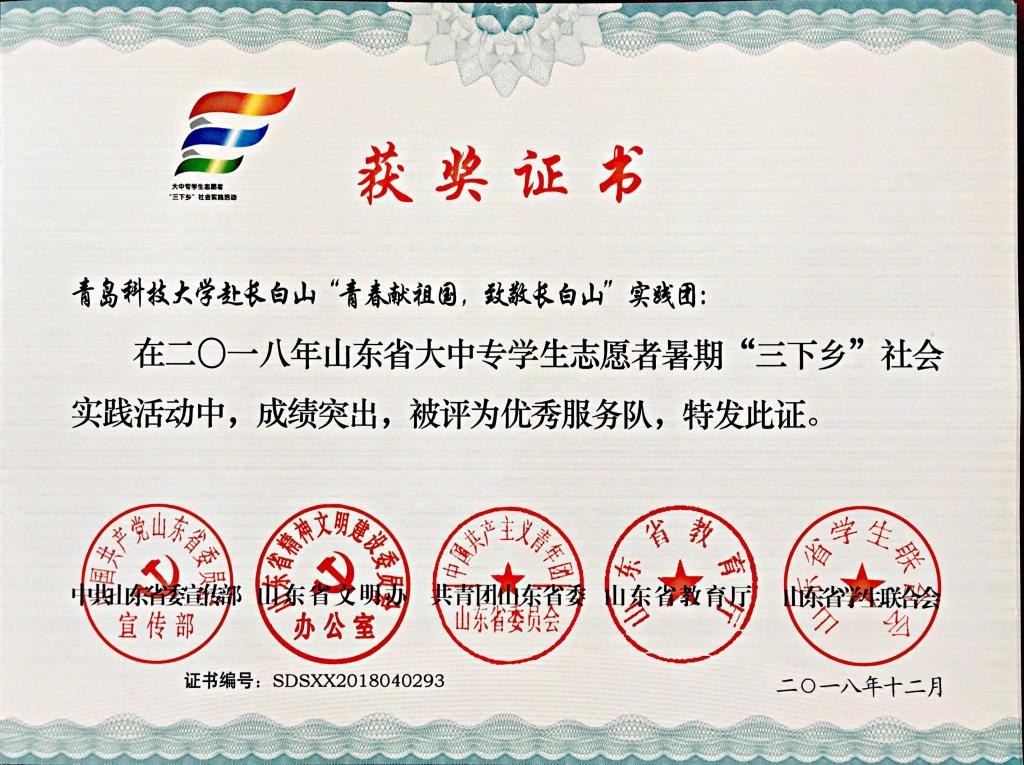 近日,2018年山东省大中专学生志愿者暑期文化科技卫生“三下乡”社会实践活动先进集体和先进个人的证书下发,pp电子“青岛科技大学赴长白山‘青春献祖国 致敬长白山’实践团” “青岛科技大学赴长白山‘青春献祖国 致敬井冈山’实践团”获“三下乡”社会实践省级优秀服务队, “青岛科技大学赴菏泽市机电荣耀下乡小分队”、“青岛科技大学赴丁里长镇张武屯村调研团”获“三下乡·千村行动”共青团助力扶贫专项行动省级优秀服务团队,曲智强、李东阳获 “三下乡·千村行动”共青团助力扶贫专项行动社会实践活动优秀指导教师,王娟娟、苗清获“三下乡”社会实践活动优秀指导教师,毕岚森等多名学生获 “三下乡”社会实践优秀学生。