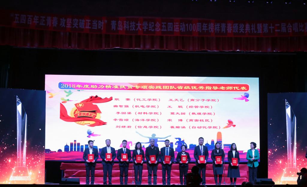 曲智强老师作为代表领取2018年助力精准扶贫专项实践团队省级优秀指导老师。在2018年我院共组建了35支社会实践团队,其中“千村行动”专项队伍5支,团中央专项3支,广大青年学生踊跃参与、扎实服务,涌现出李东阳、王娟娟、苗清、毕岚森等一大批先进集体和先进个人。