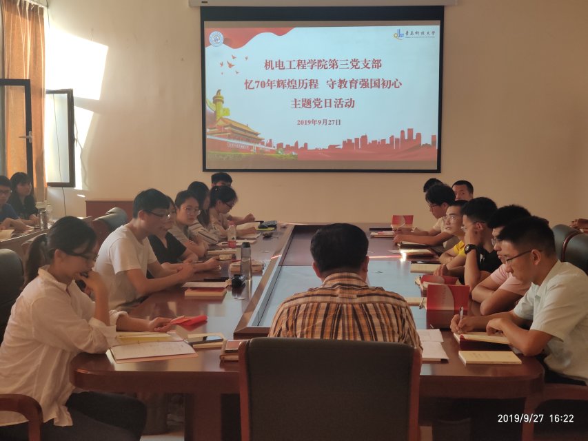 为贯彻青岛科技大学召开“不忘初心、牢记使命”主题教育工作会议精神、贯彻校组织部关于党支部组织生活指导意见,在中华人民共和国成立70周年到来之际,充分发挥党员的榜样示范作用,营造爱国氛围、凝聚奋进力量,引领广大师生继承和发扬爱国主义精神,不断提升党的凝聚力和引领力。9月27日,pp电子官方网站第三党支部在pp电子518会议室举行“忆70年辉煌历程 守教育强国初心”主题党日活动。第三党支部全体党员参加了活动,活动由党支部书记王作辉主持。