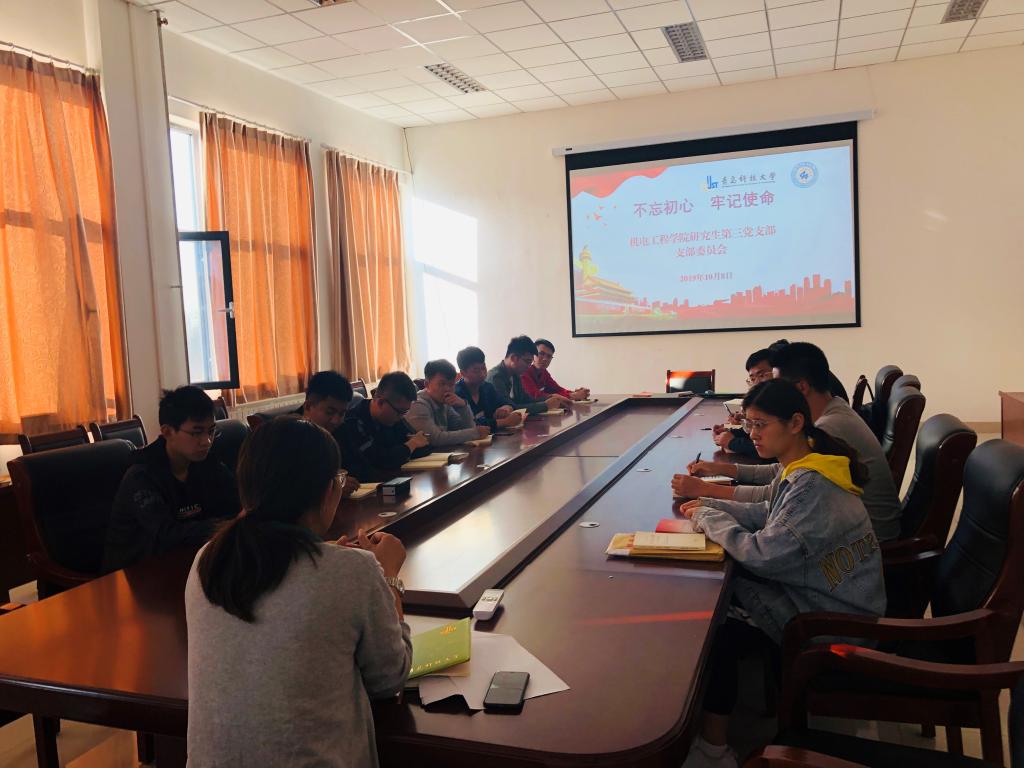 为认真贯彻落实学校“不忘初心、牢记使命”主题教育工作安排,激发研究生新生党员树立正确的人生观、价值观,强化自身的责任意识和使命担当精神,营造爱国爱校氛围、凝聚奋进力量,10月8日下午,pp电子官方网站研究生第三党支部在机电楼518会议室召开 “不忘初心再出发,牢记使命勇担当”主题教育会议,pp电子党总支副书记兼副院长王伟参加并主持了会议。