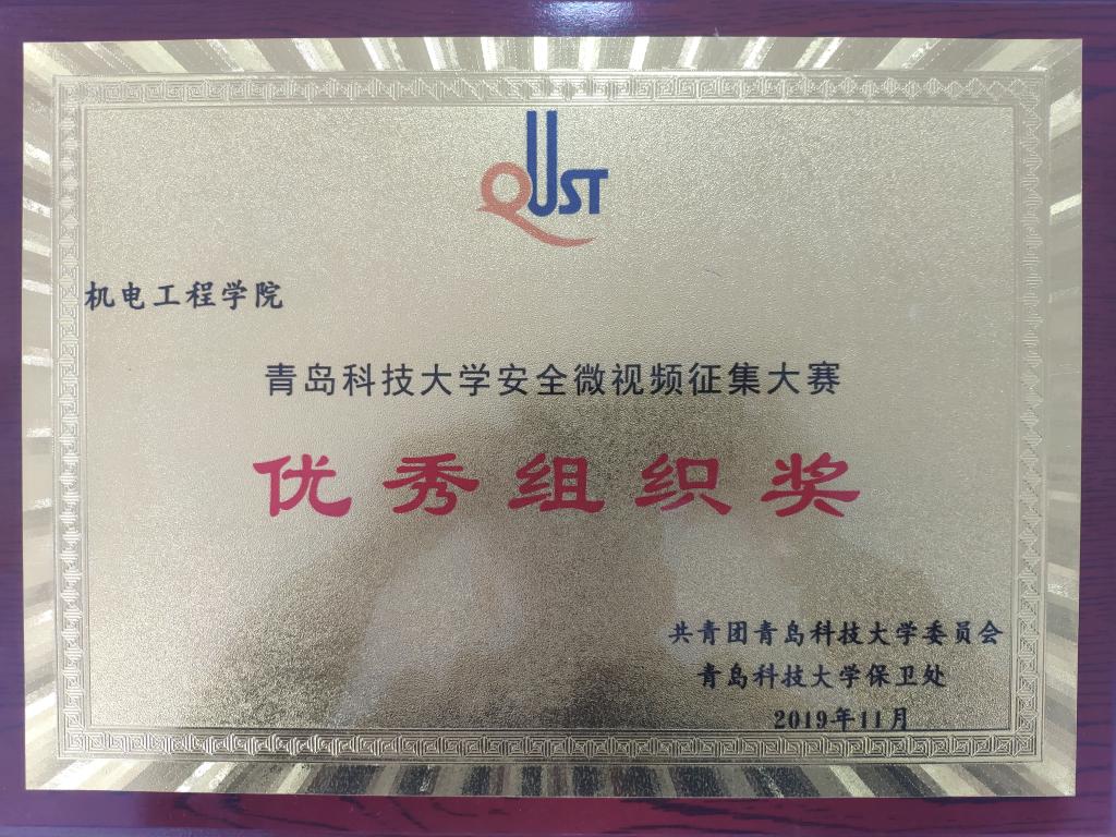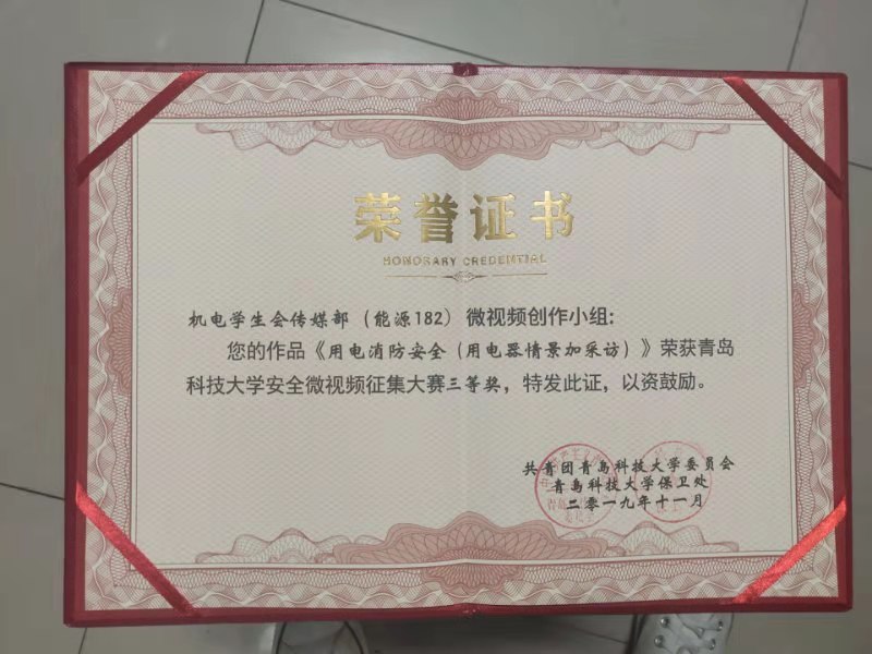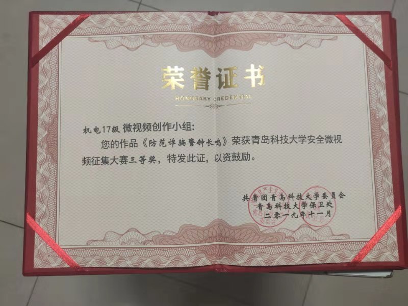 11月19日,青岛科技大学安全主题微视频征集活动颁奖仪式在尚舜报告厅举行,pp电子在此次征集活动中获得佳绩。其中,17级学生制作的《防范诈骗警钟长鸣》、机电学生会传媒部(能源182)制作的《用电消防安全(用电器情景加采访)》荣获三等奖,pp电子荣获优秀组织单位荣誉称号。