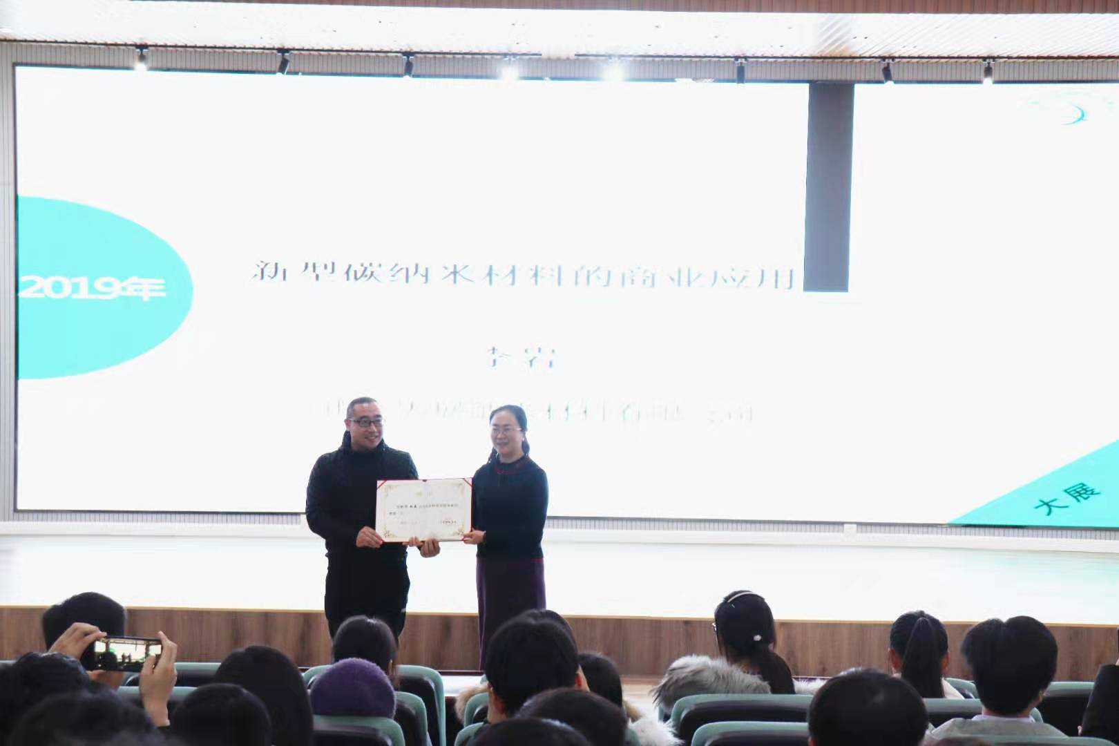 11月28日,pp电子、山东省高性能碳材料制备及应用工程实验室邀请大展纳米材料有限公司李岩教授来我院做学术报告。pp电子院长何燕参加了报告。