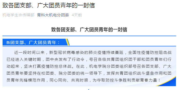 “党有号召,团有行动。”pp电子分团委组织部发表《致各团支部、广大团员的一封信》,号召各团支部、广大团员青年要坚持在校团委、院分团委的统一领导下,发挥共青团组织战斗堡垒作用和团员青年先锋模范作用,同心同向、共克时艰,为夺取防控斗争胜利贡献青春力量!号召机电学子服从指挥有纪律、正确发声有作为、履行职责有担当、网络学习由效率。pp电子各团支部纷纷行动起来,依托网络平台,采取多种方式开展支部学习会。船舶192团支部开展《同心同向 共克时艰》主题团日活动;新能源191团支部在学习强国平台建立“举国战‘疫’ 人人有责”学习群,线上学习疫情防控知识及要求,与祖国携手同行,为武汉加油;机械191团支部通过制作精美PPT向广大团员传递疫情知识、解读习近平总书记重要讲话精神;设计191团支部通过书写字帖、画作为武汉加油。分团委学生会宣传中心也制作了《武汉加油!中国加油!与你同在!》短视频为湖北疫区同学加油鼓劲,制作了《风雨同舟共抗疫情,我们比你更关心你的健康》《新型冠状病毒如何防护?快看这里》等推文,做好防疫宣传工作。