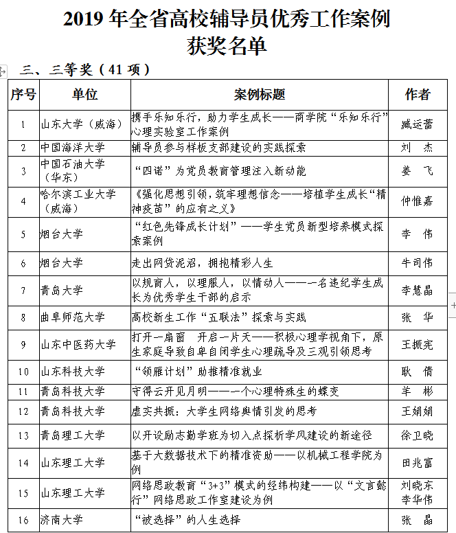 近日,在山东省教育厅(省委教育工委)公布的全省高校辅导员2019年度优秀工作案例中,pp电子王娟娟老师的《虚实共振:大学生网络舆情引发的思考》、羊彬老师的《守得云开见月明——一个心理特殊生的蝶变》获得三等奖。