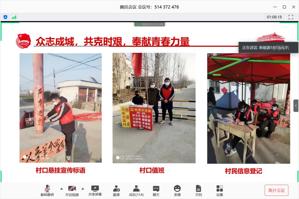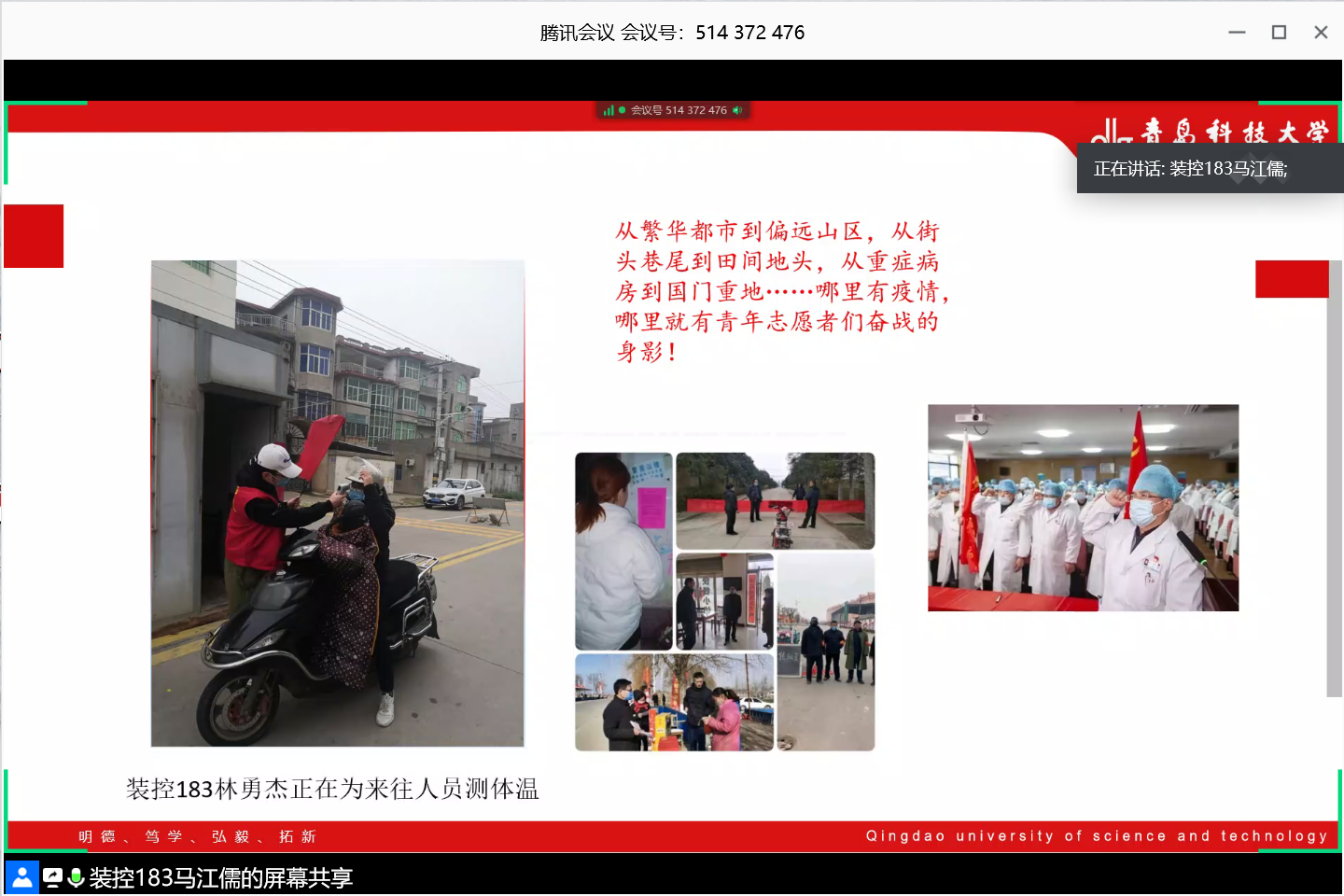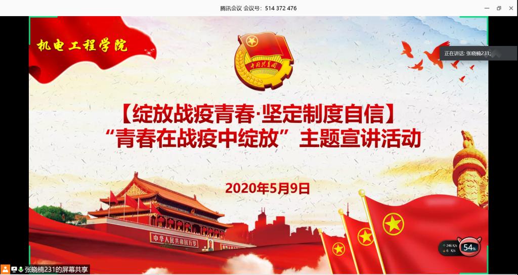 为深入贯彻落实习近平新时代中国特色社会主义思想对青年行动的指导,5月9日,在纪念五四运动101周年、新冠疫情防控阻击战取得重大战略成果之际,pp电子分团委组织部举办“青春在战疫中绽放”线上主题宣讲活动。分团委组织部部长王娟娟老师出席了活动,罗浩宇、刘龙、马江儒和马元宇四位团员作为机电团员青年战疫典型代表宣讲了他们勇战疫情的青春故事,17级、18级、19级200余名团学骨干通过“腾讯会议”参与了活动。活动由分团委组织部副部长张晓楠主持。