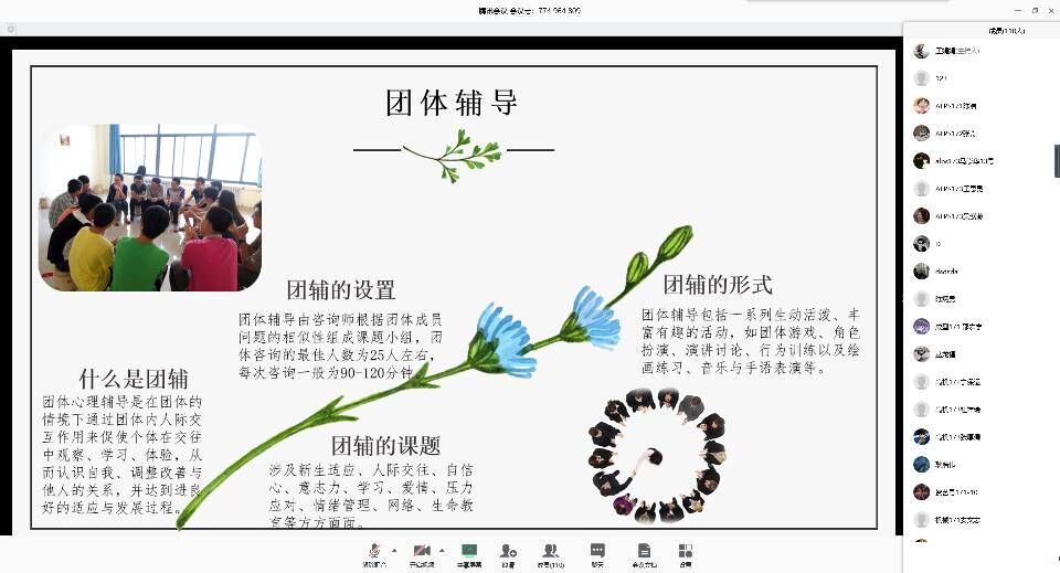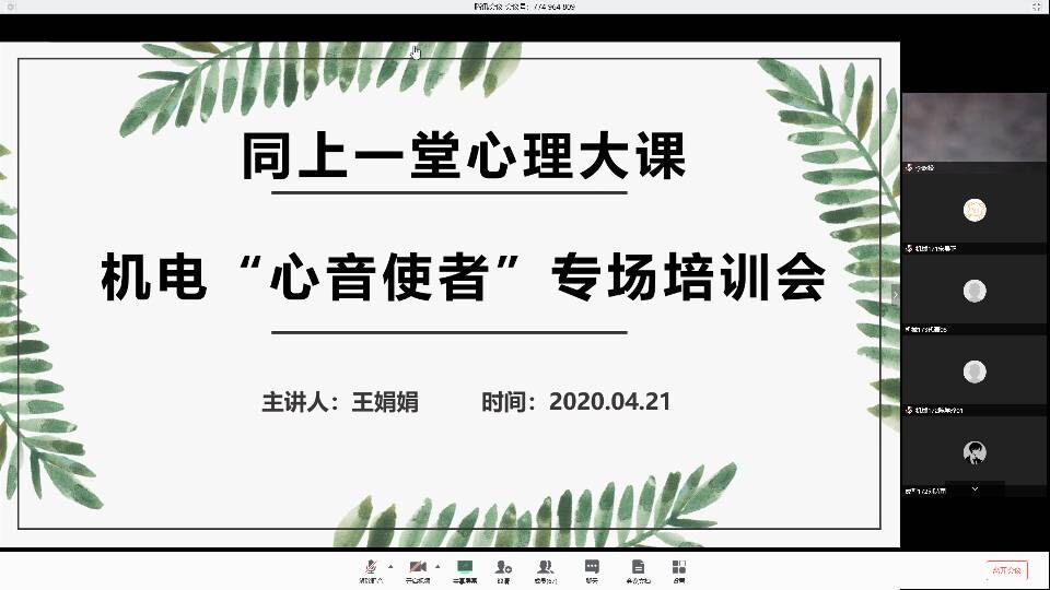 为进一步完善学校、学院、班级、宿舍“四级”工作体系建设,提高朋辈助人、自助能力,提升学生获得感、幸福感、安全感,增强大学生心理健康素质,4月21日下午,针对18级、17级和16级开展了“同上一堂心理大课”----机电心音使者专场培训会。通过腾讯会议平台,共有520名心音使者参与培训,培训由pp电子心理工作站王娟娟老师和曲智强老师分别主讲。