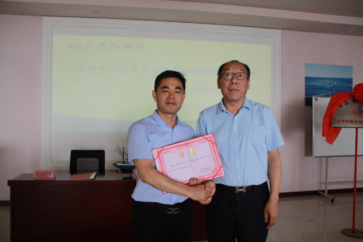 仪式上,孙立军为仲辉颁发青岛科技大学pp电子官方网站创业导师聘书,肖强与仲辉签订《大学生就业创业实践基地协议书》,张卫锋与仲辉共同为大学生就业创业实践基地揭牌。