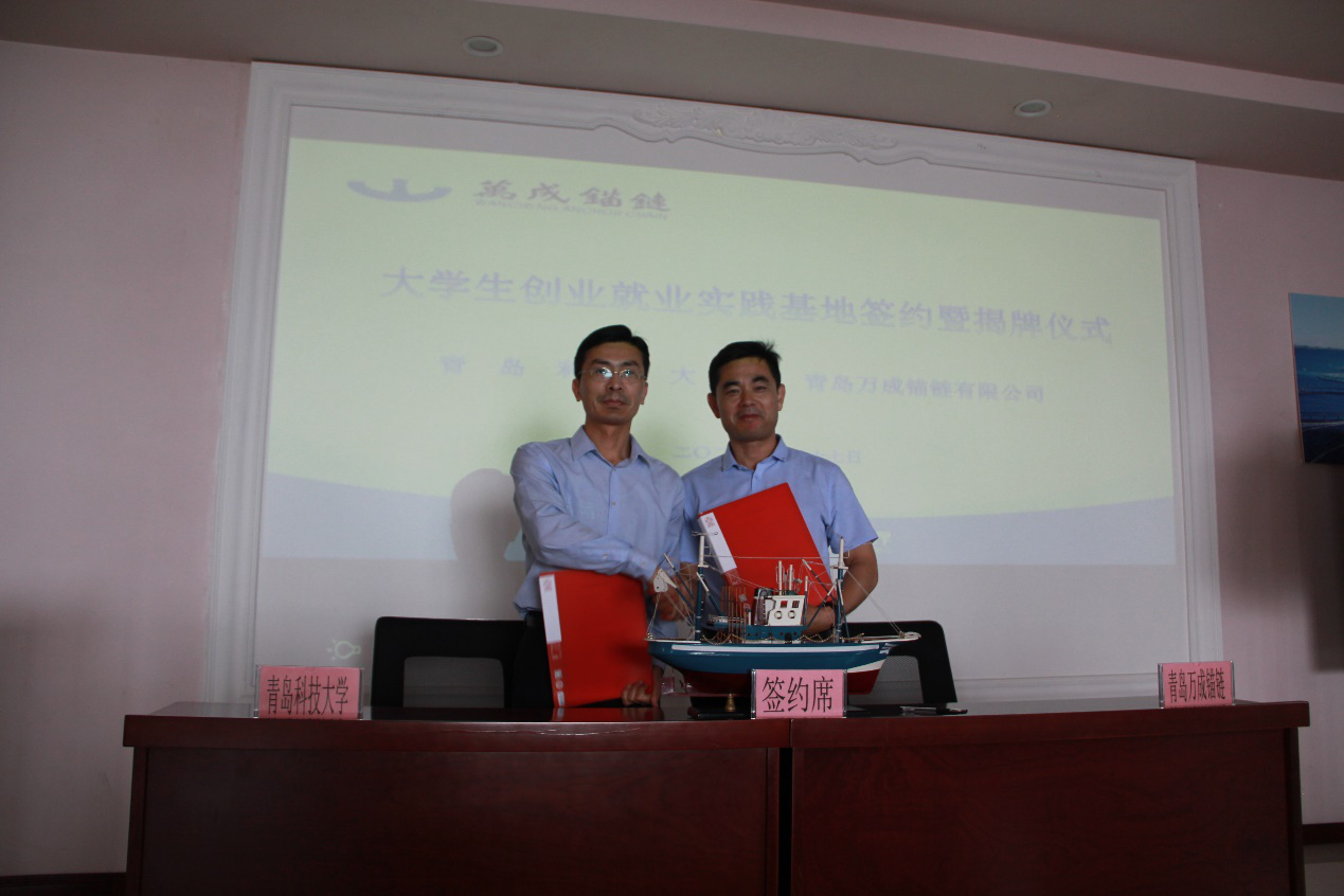 6月17日,青岛科技大学pp电子官方网站、青岛万成锚链有限公司共建大学生就业创业实践基地揭牌仪式在万成锚链公司举行举行。青岛科技大学pp电子官方网站党委书记孙立军、青岛万成锚链有限公司董事长仲辉、学院党委副书记肖强、副院长张卫锋、万成锚链执行总经理王吉强,副总经理、业务中心经理马静、行政人事部经理山长海、销售大区经理宋修鹏等出席签约揭牌仪式。