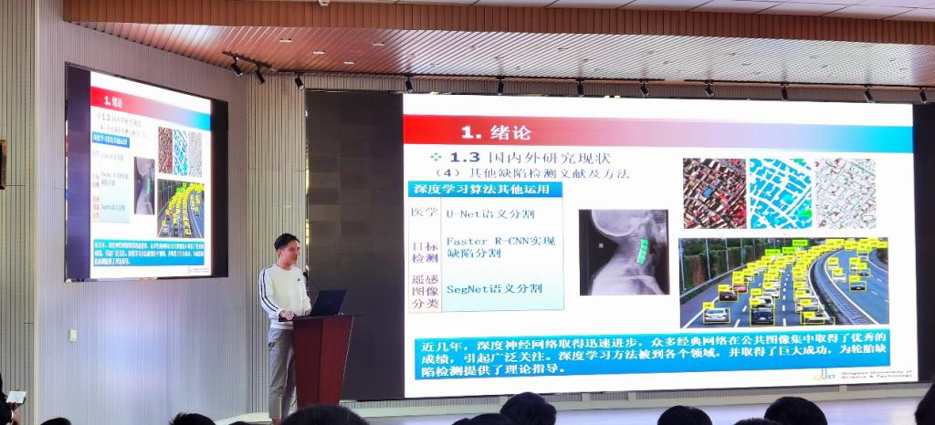 本次会议采取比赛形式,共分为三个环节,分别为课题报告、评委点评、自由提问。本期学术报告主要围绕机械工程方向展开。郑洲洲、安瑞、王晶晶参加了此次报告,郑洲洲做了题为《基于深度学习的轮胎缺陷检测研究》的报告,主要围绕卷积神经网络的性能进行了研究并提出了创新性;安瑞做了题为《废旧移动终端整机无损拆解技术》的报告,介绍了机器视觉应用系统以及机器视觉在手机拆解中的应用;王晶晶做了题为《橡胶裂解电磁设备及强化传热机理研究》的报告,主要从传统废橡胶的主要处理方式和裂解的可行性等方面对课题进行研究。汇报结束后,评委老师凭借他们渊博的专业知识和丰富的科研经验对报告中存在的问题和不足加以指导,并提出了宝贵的意见。