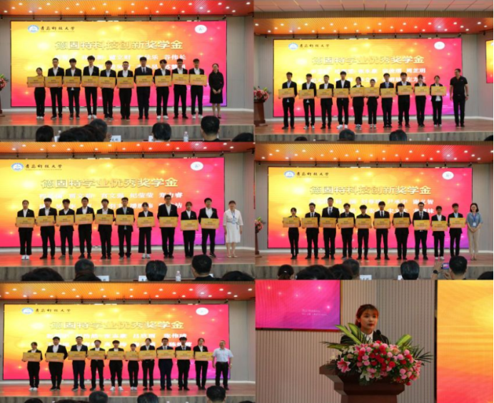 此次评选了德固特学业优秀奖学金30人,德固特科技创新奖学金20人,每人奖励2000元,共计10万元。青岛德固特节能装备股份有限公司总经理刘汝刚、副总经理崔建波,学生处副处长王丽,校团委副书记张玉,pp电子院长何燕为奖学金获得者颁奖。获奖学生代表贾文茹同学发言。