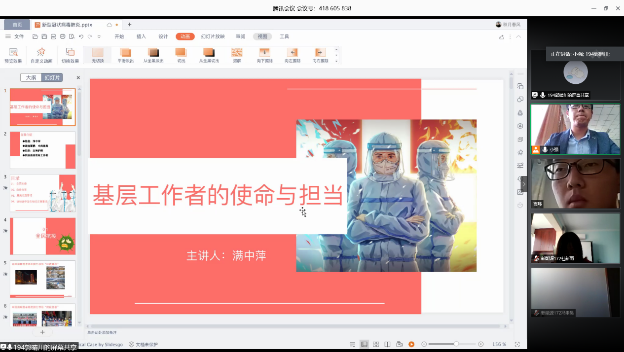5月19日,pp电子官方网站本科生第二党支部召开了“提高防护意识,加强自我保护”的线上座谈会并观看防疫视频,旨在引导广大党员强化纪律意识,学习正确的防疫知识,保护好自己和他人,不断在疫情防控中作出新的更大的贡献。会议邀请了专业医护人员满中萍同志和罗浩宇同学来分享他们在疫情期间的抗疫经历,会议由党支部书记曲智强老师主持,党支部全体成员参加。