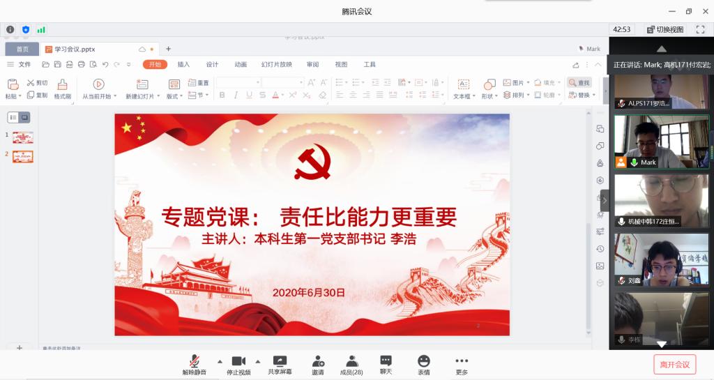 为贯彻落实全国全省基层党建工作重点任务推进会精神,根据中组部“党课开讲啦”活动安排、省委组织部和学校有关通知要求,按照学校《关于开展“我来讲党课”活动的通知》部署,6月30日下午,pp电子官方网站本科生第一党支部书记李浩在腾讯会议主讲“迎七一”专题党课。全体学生党员参加党课学习,会议由王玉凯老师主持。