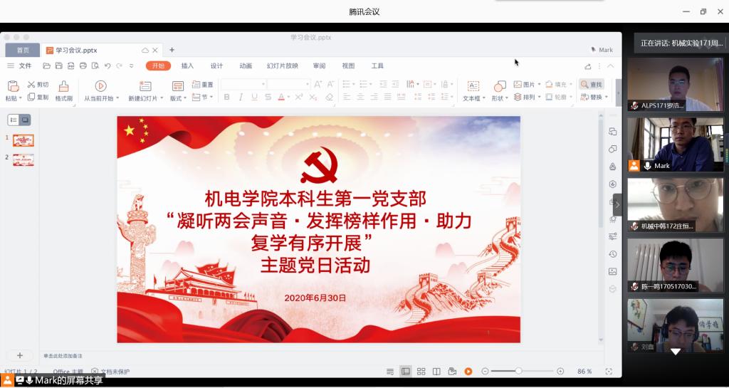 为更好地学习贯彻两会精神,弘扬战 “疫”精神,引导广大党员坚定理想信念、恪守党的宗旨,发挥党员的先锋模范作用。6月30日下午,pp电子本科生第一党支部召开“凝听两会声音·发挥榜样作用·助力复学有序开展”主题党日活动。本科生第一党支部全体党员参会,会议由党支部王玉凯老师主持。