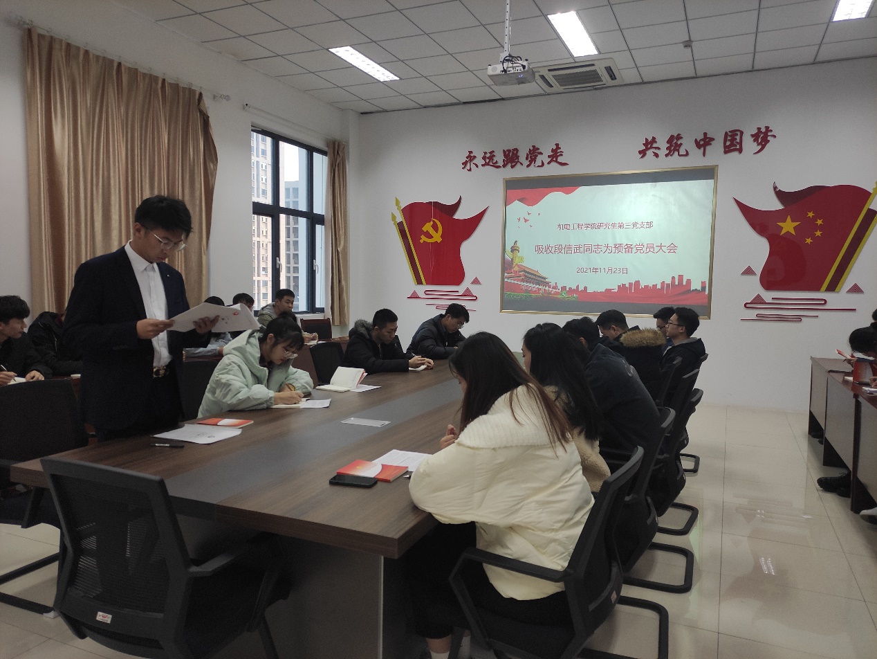 11月23日下午,pp电子官方网站研究生第三党支部在机电楼529会议室召开预备党员转正大会,支部党员全员参加会议,会议由宗萌主持。