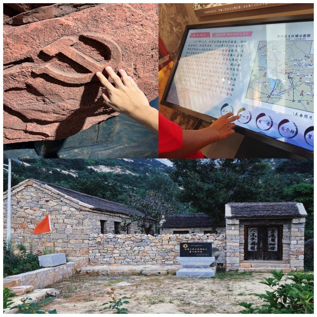 走出纪念馆,我们来到一座郁郁葱葱的山岗前,这里有石头垒的石屋,石屋被欣欣向荣的绿植包围着,好似那中国共产党人,有着坚韧不拔的生命力。通过门口的石碑我们才知道这里是徂徕山抗日武装起义的旧址,先辈们曾在此处部署军队,抵抗外敌。门口的红旗随风飘扬,如星星之火,成燎原之势。而后我们又在周围闲散的参观了一会,正当我们疲乏怠慢时,一块雕刻着中国工农红军标志的石头顿时吸引起我们的注意。那块石头是那么的普通,好似路边随便捡的一块大石块,可那上面雕刻的标志确实那么的板正,我们想这就是老一辈人抗日战士们对党、对党的领导坚定不因的信任,这便是信仰,在那个战火纷飞的年代,这份信仰支撑着他们顽强抵抗、自强不息。
