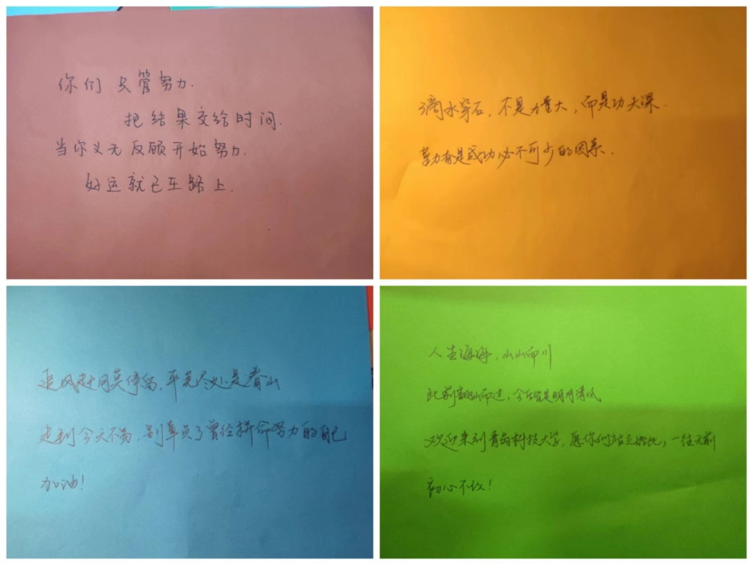活动第二项,pp电子官方网站孙坤岩、王作辉、宋达、穆青青老师对新生们写下寄语,“师情献语暖人心”每一位老师都倾心呵护自己的学生,每一位老师都对自己的学生有无尽的言语要表达。由多位辅导员亲笔临写祝福语和期望话,表达对学生们的关切,也是希望同学们不辜负大学四年生活,通过现在努力,创造自己的美好未来。浏览完辅导员的寄语后,在场的每一位同学心中都涌入一股暖流,进一步巩固了师生情谊。