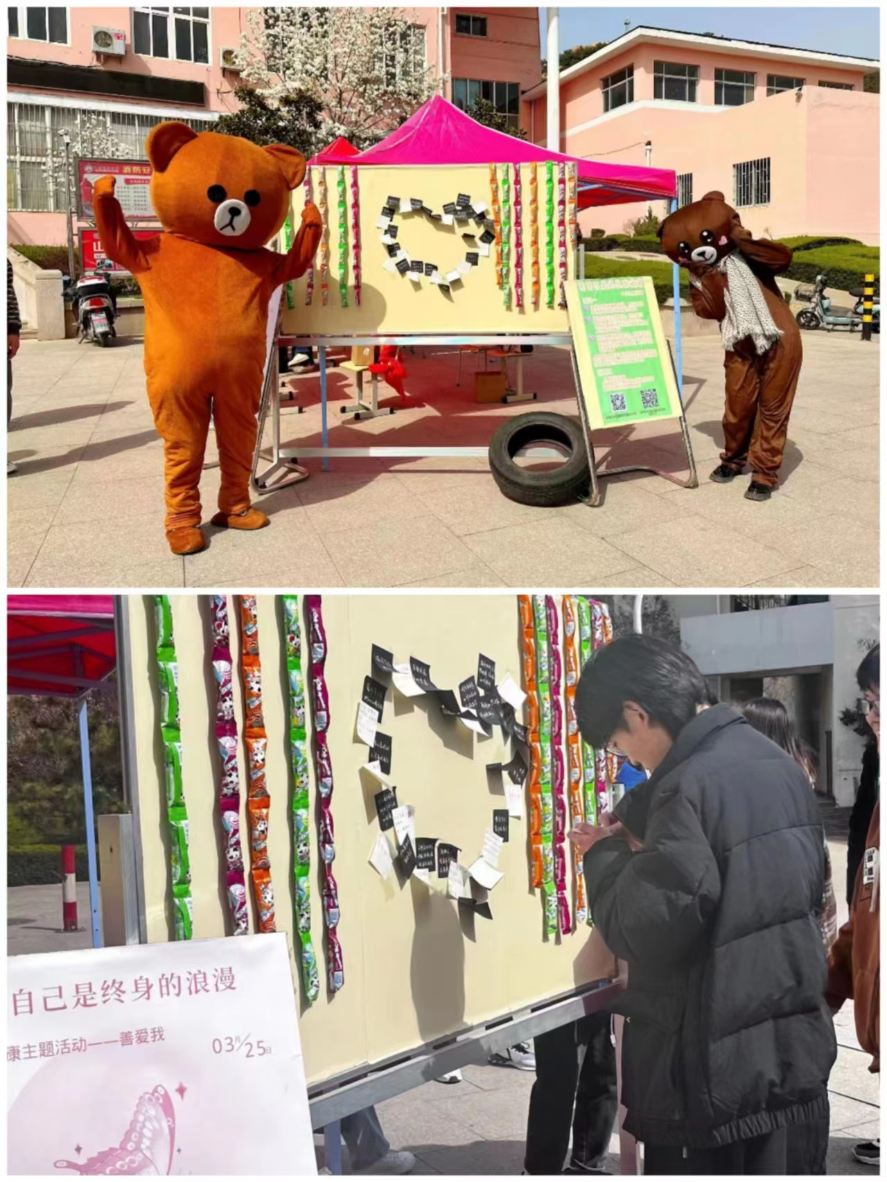第三个活动——拥抱大熊,去除烦恼。每个人在烦恼无助的时候,往往需要一个控制情绪的依靠。大熊正是健康、积极、阳光的代表。通过拥抱大熊,每个人的烦恼会随着拥抱挥之而去。大熊给予的温暖怀抱使同学们心灵充满希望。此外我们发放祝福小卡片,对同学们给予祝福。