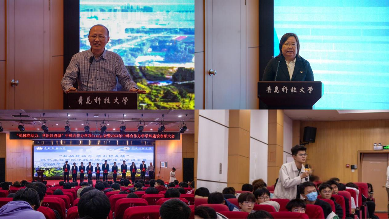 学院副院长杨化林详细介绍了中韩合作办学项目的由来和汉阳大学的基本情况。杨化林指出:学校学院大力推进中外合作办学,并作为学校的办学特色,旨在为同学们提供优质的海外教育资源和广阔的学习发展空间,培养具有全球视野和竞争力的工程专业技术人才。学院评建办主任付平围绕培养模式、课程设置、出国留学条件等方面就中韩合作办学项目出国选拔政策进行解读。赴韩留学学生代表李晨睿、陈建翔、满孝霖结合自身学习和留学经历,分享了在韩留学的宝贵经验,2024年暑期研学学生代表杨桐、张舒涵分享了汉阳大学访学见闻,让同学们对韩国的学习、工作和生活环境有了更加直观的了解。会议表彰了中韩合作办学项目相关专业涌现出的优秀学生、标杆宿舍、科创之星、研学优秀学员、TOPIK之星等46人。在师生互动答疑环节,与会老师一一解答了同学们的疑问。