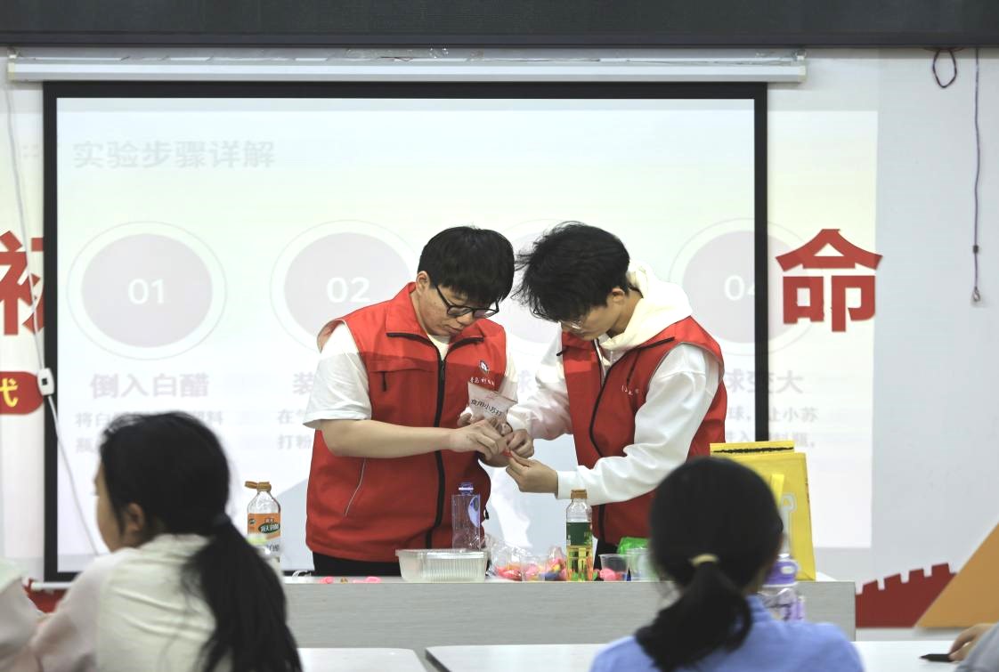 课堂上,孟仪琳和赵再强向小朋友们展示了小苏打反应的神奇原理,并围绕二氧化碳的生成设计了三个趣味实验——“生气的瓶子”、“蓝海沉浮”和“漂浮的泡泡”。志愿者通过互动问答和实验演示,向孩子们生动讲解了实验步骤与科学现象。