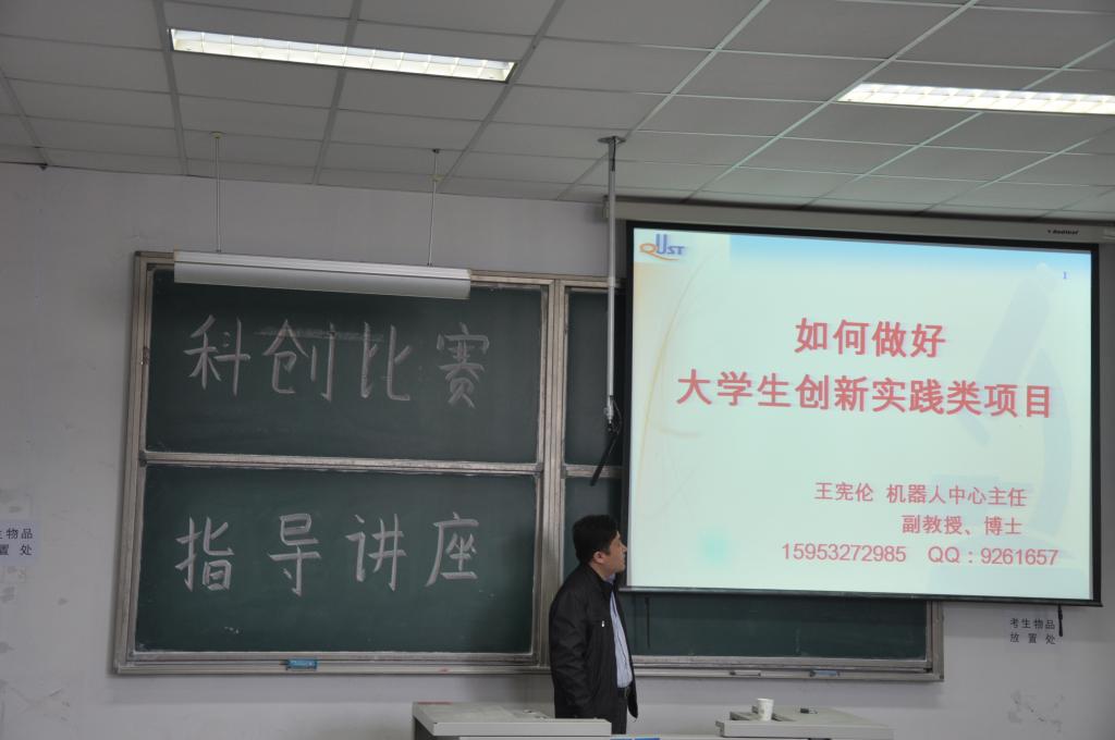 4月21日上午9:00,由pp电子科技创新协会组织举办的科创比赛指导讲座于弘毅楼E区103教室举行,pp电子机器人中心主任王宪伦亲临现场指导,讲座吸引了广大科技爱好者积极参加。