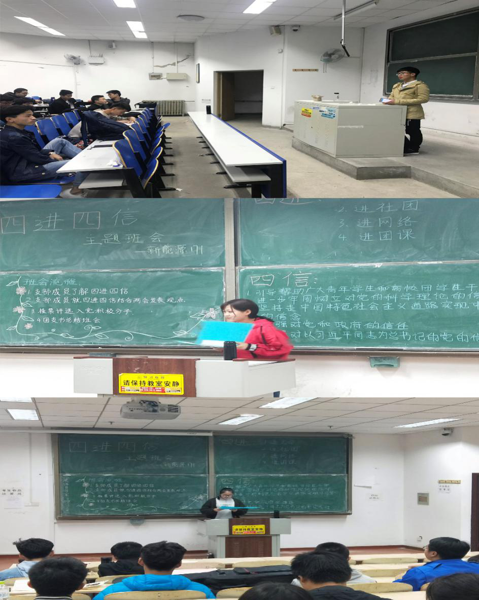 活动把学习宣传贯彻习近平新时代中国特色社会主义思想和党的十九大精神作为首要政治任务和核心工作业务,pp电子官方网站分团委组织部扎实推进“四进四信”活动,切实以“四进”增强“四信”,以“四信”促进“四进”,各级团学组织深入开展了“四进四信”与全国两会主题班会。