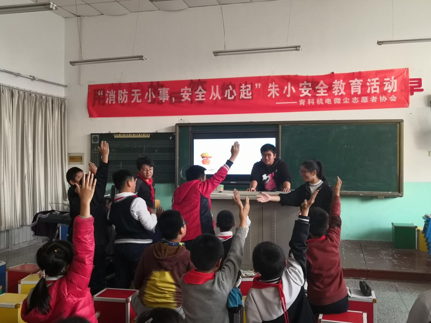 pp电子微尘志愿者协会于11月13日下午2:00走进朱家洼小学进行了安全教育活动。众所周知,11月9日是全国消防日。所以志愿者们趁此机会给孩子们讲述基本的防火安全常识和防范措施,带着他们认识一些消防设施。并与学生们进行互动交流,大大提高了小学生们的安全防患意识。更吸引人的是有奖问答环节,孩子们踊跃举手发言,与此同时,志愿者们准备了笔和本子等奖品来奖励那些积极发言的孩子。