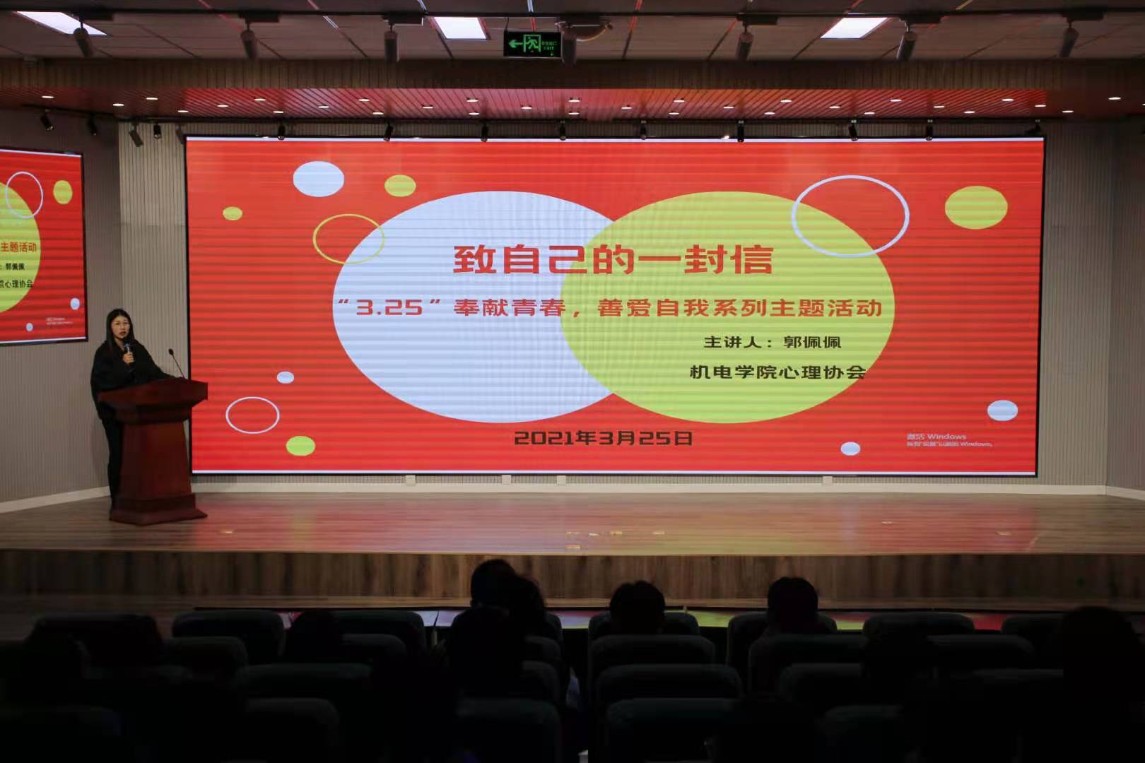 为增强大学生的心理自我调节能力,养成良好的心理品质,引导大学生善待自我,关爱他人,健康成长,促进学生全面协调发展。3月25日晚,pp电子开展了“致自己的一封信--3.25奉献青春,善爱自我”系列主题活动,会议由心理工作站站长郭佩佩老师主持。