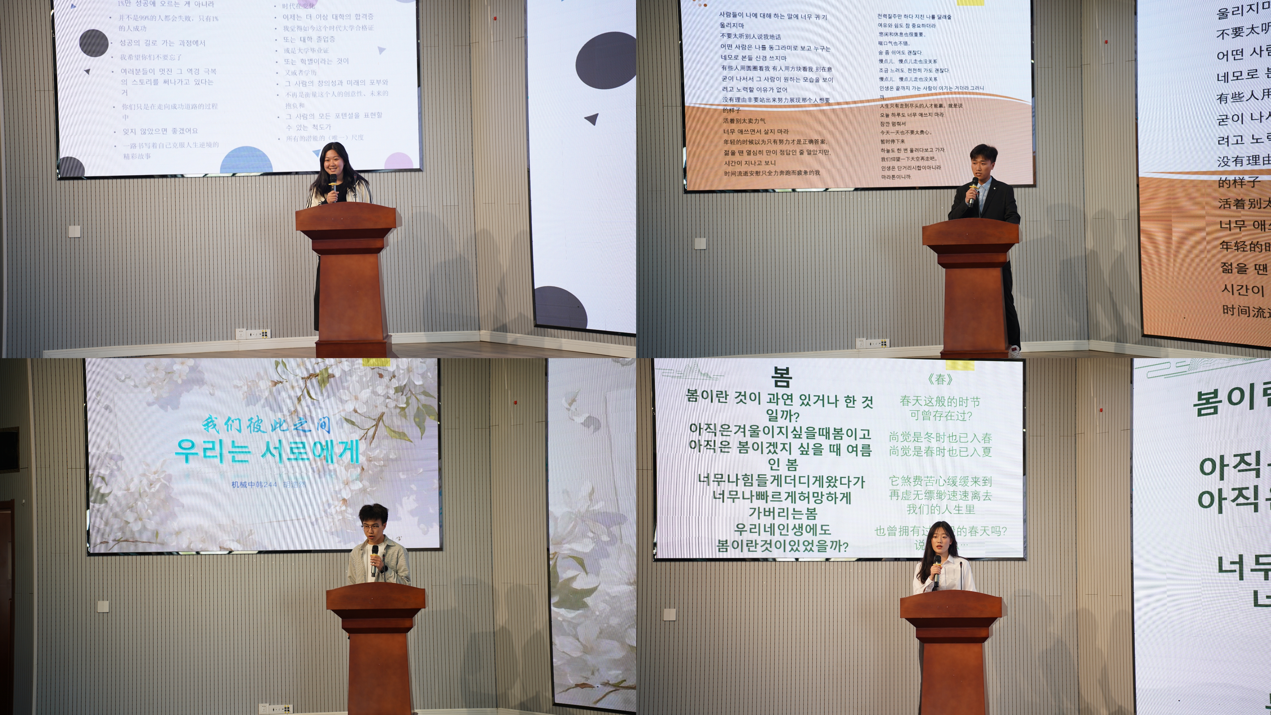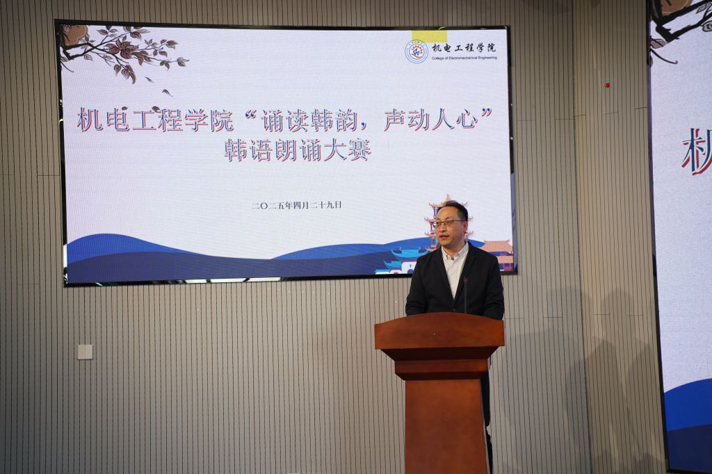 韩韵悠悠耳畔响,诗风缕缕润心田。2025年4月29日下午,pp电子官方网站成功举办“诵读韩韵,声动人心”第一届韩语朗诵大赛。此次大赛旨在提升学生韩语水平,激发韩语学习兴趣,吸引了机械工程(中韩合作办学)专业、材料成型及控制工程(中韩合作办学)专业学生的广泛参与。pp电子官方网站副院长李剑光、合作办学办公室主任付平、中韩合作办学师生代表80余人参加此次活动。韩语教师刘雪云、马敏、李静作为本次评委。